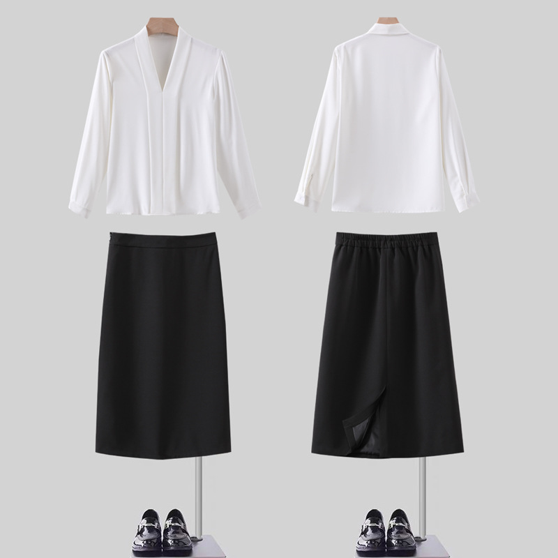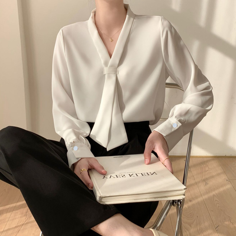 白色衬衫大码女装胖mm宽松韩版长袖缎面雪纺系带衬衫职业打底衬衫
