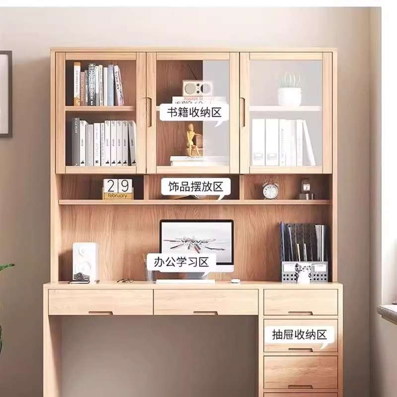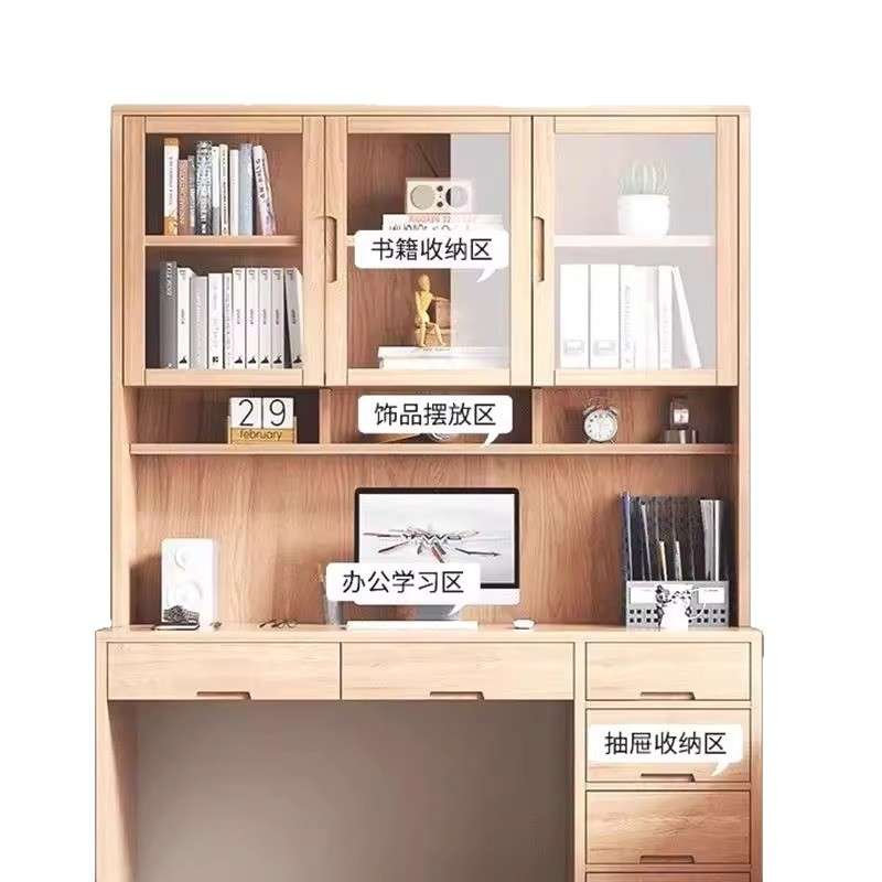橡木全实木书桌书架一体电脑桌书柜儿童学习现代简约办公桌柜子