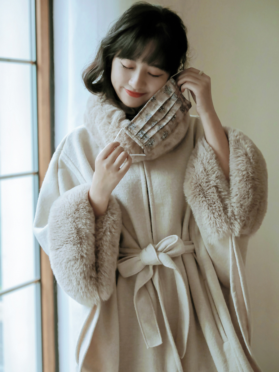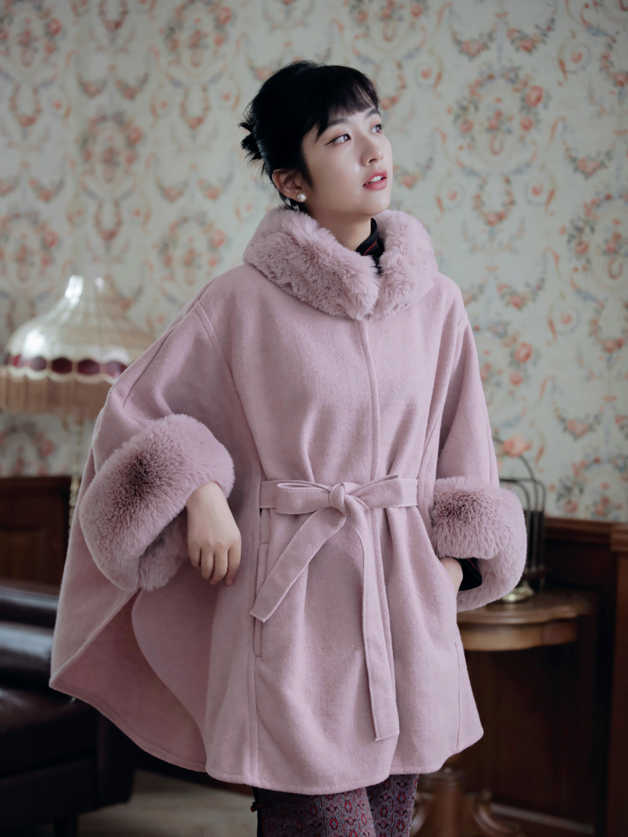 茉茉秋冬季 民国复古日常 蝙蝠袖 纯色保暖大衣式 毛领斗篷外套