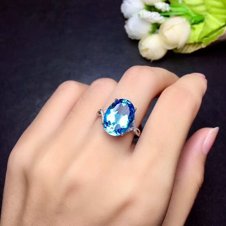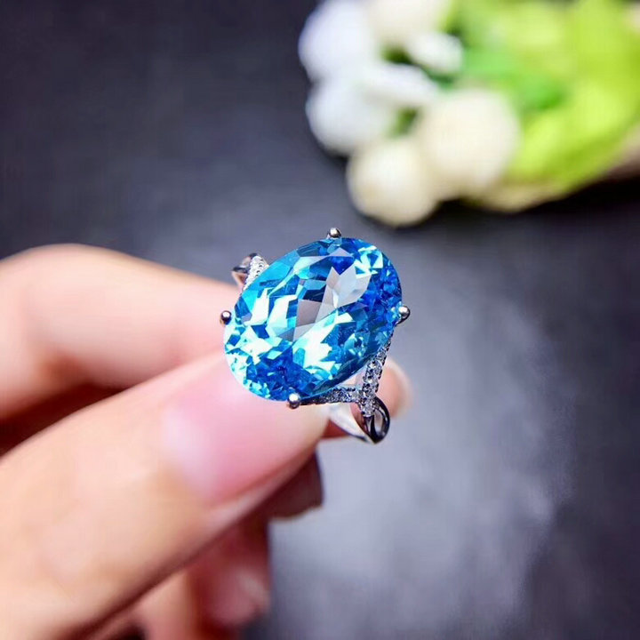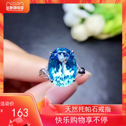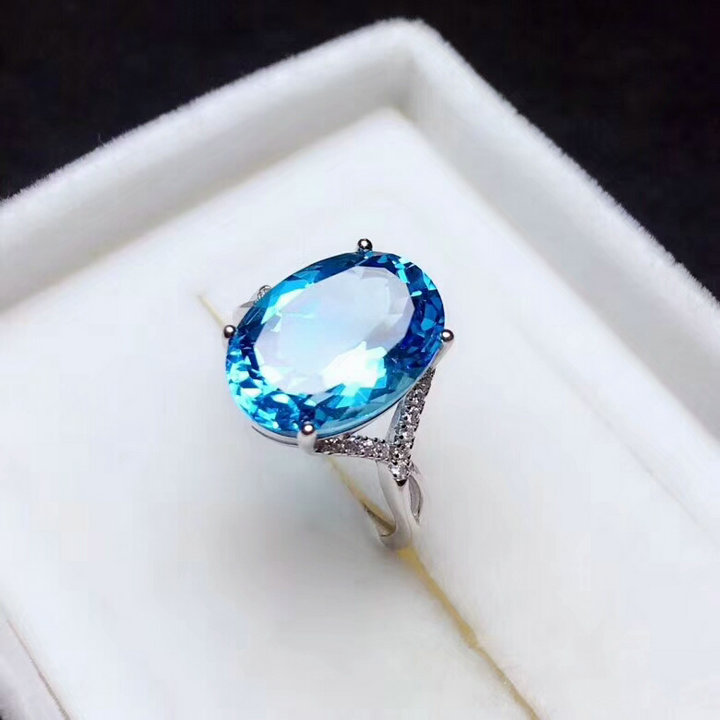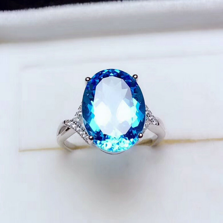 天然托帕石蓝水晶海蓝宝戒指女宝石银指环戒子首生日送女友礼原石