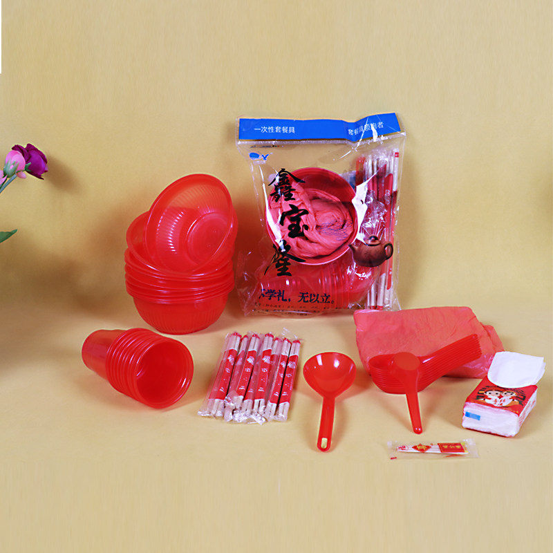 一次性碗筷套装酒席家用环保加厚杯碟勺子结婚喜宴红色塑料餐具碗