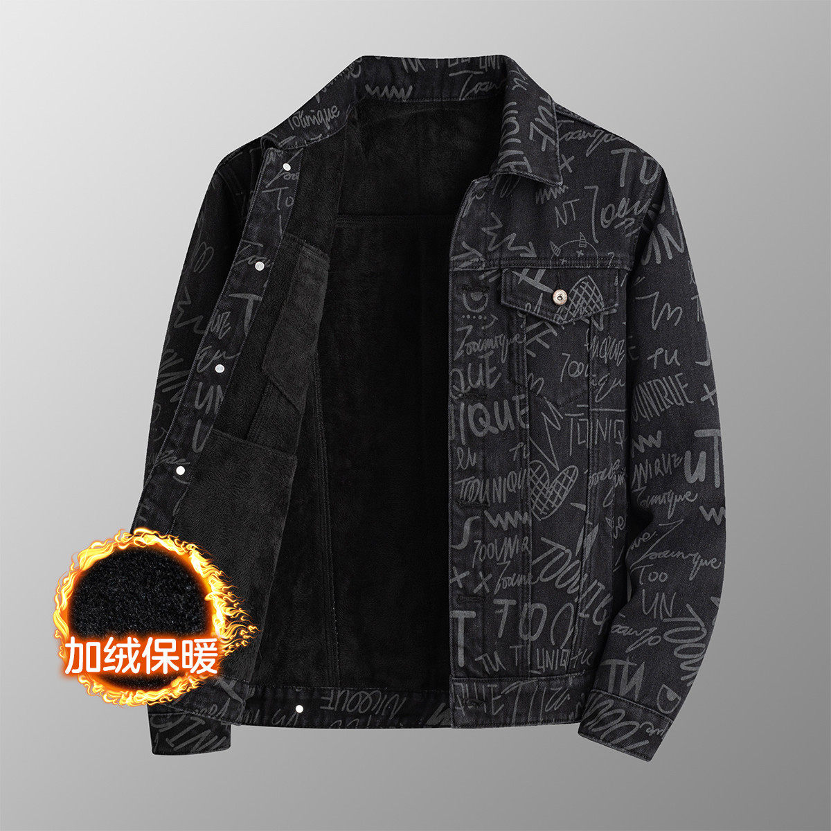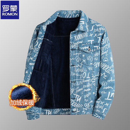罗蒙满印款秋冬加绒加厚男夹克英文字母印花潮流时尚工装牛仔外套