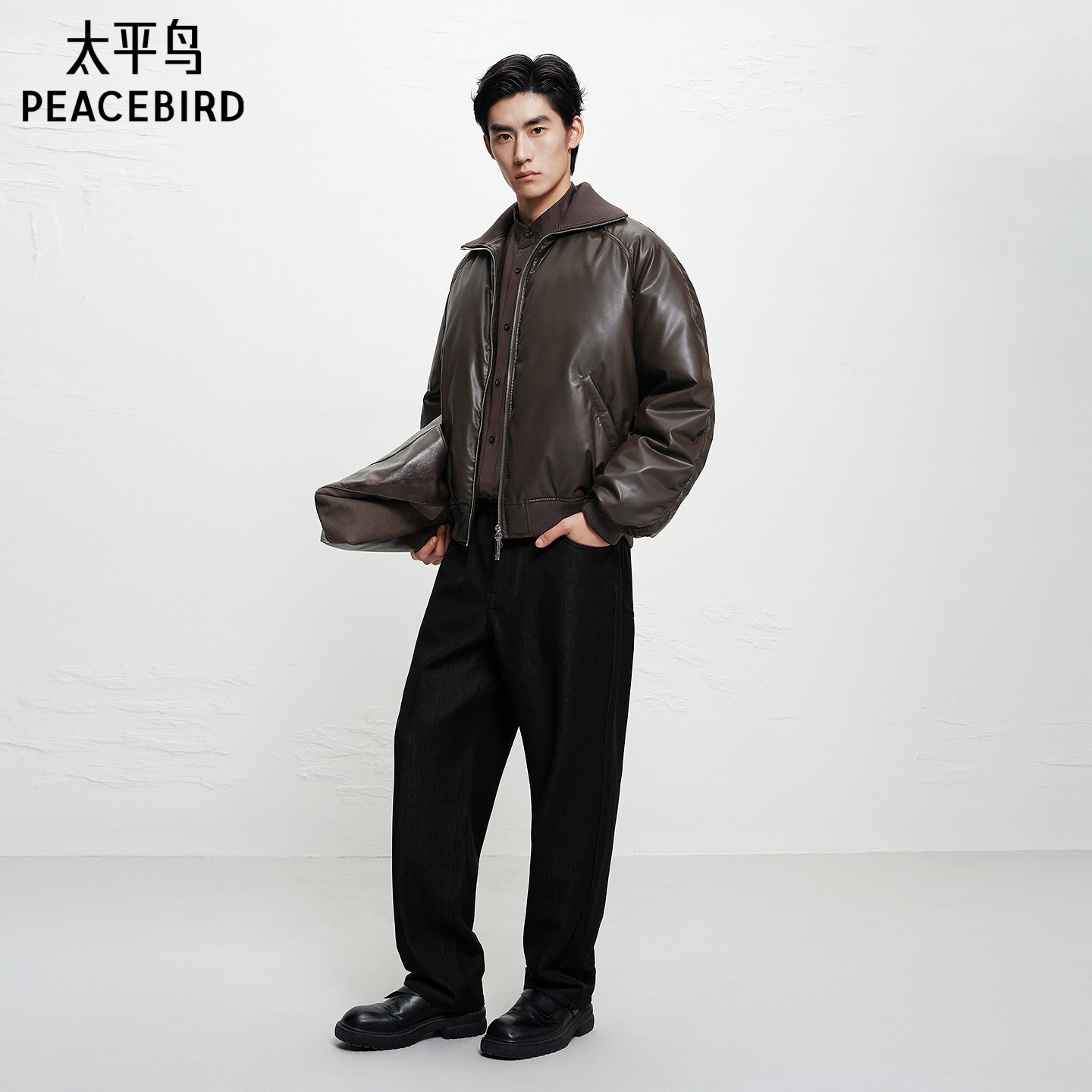 【商场同款】太平鸟男装鹅绒羽绒服翻领仿PU皮面包服潮B1ACF4C13