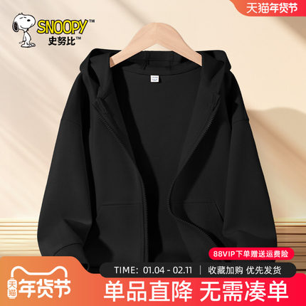 史努比男童外套秋2025新款男大童黑色连帽卫衣秋季儿童上衣运动服