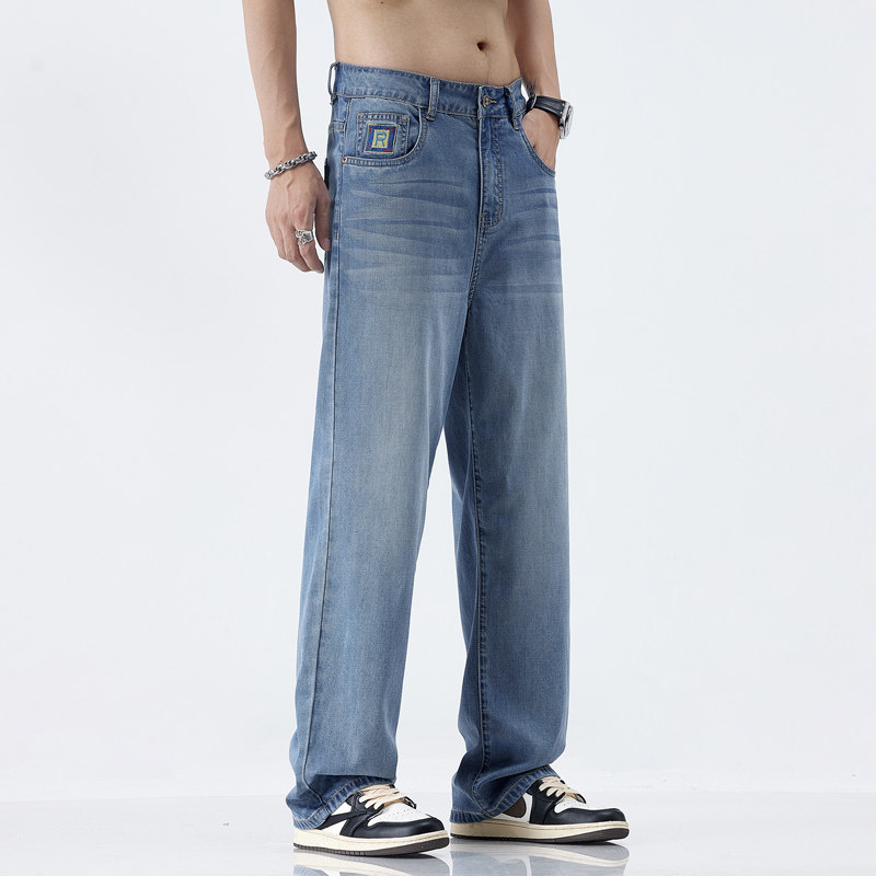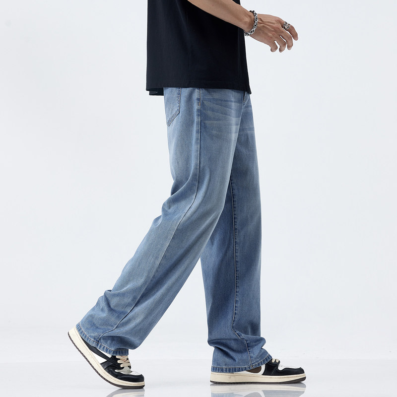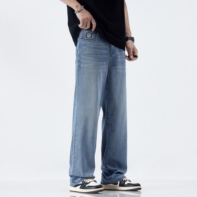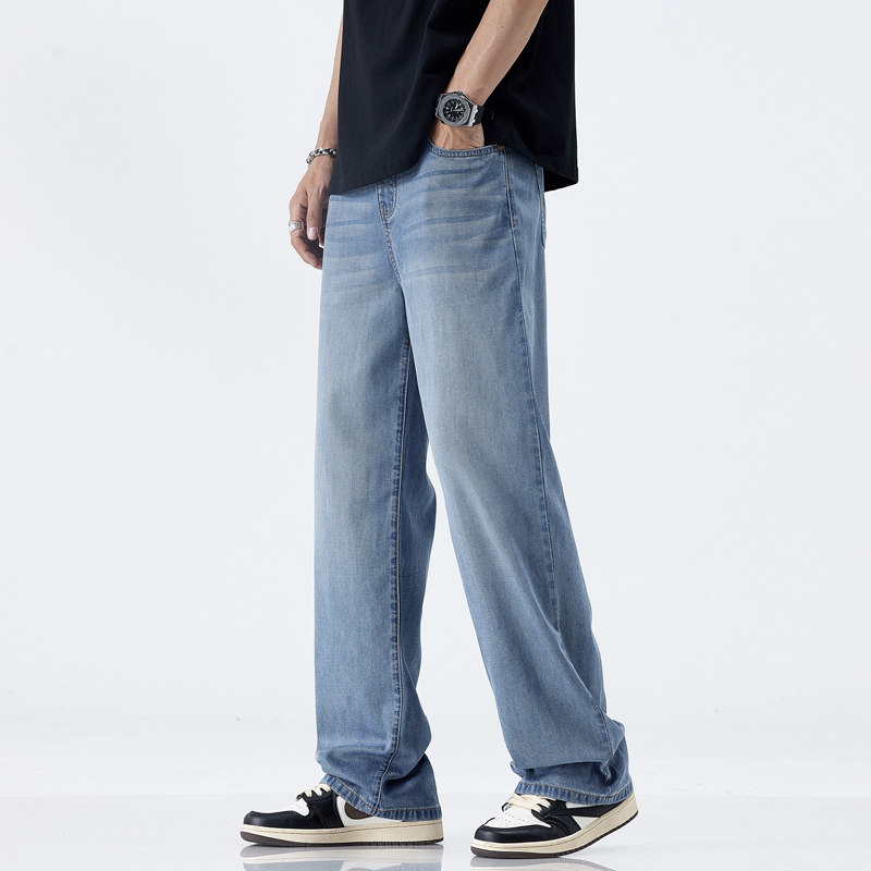 夏季潮牌牛仔裤男士天丝冰氧超薄显瘦宽松百搭垂顺直筒阔腿长裤子
