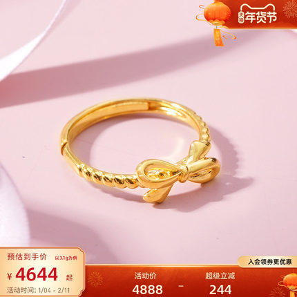 老庙黄金足金999甜心蝴蝶结编织麻绳活口戒指5G在逃公主送女友