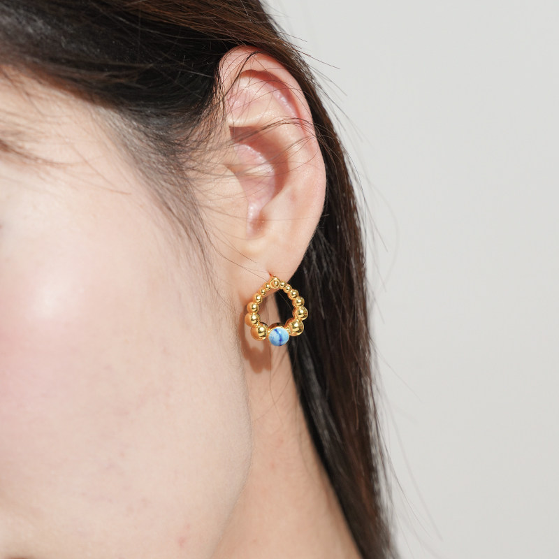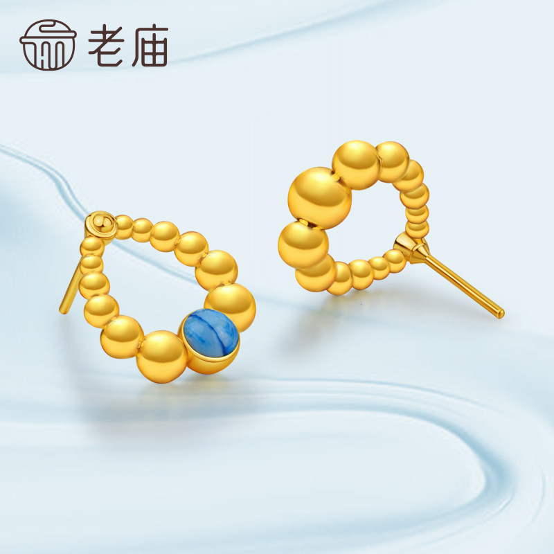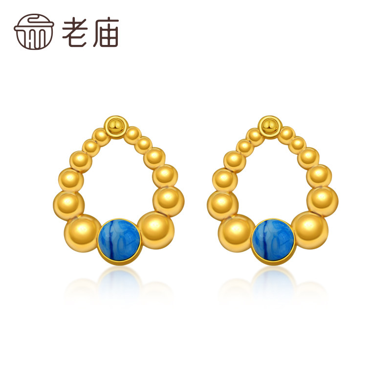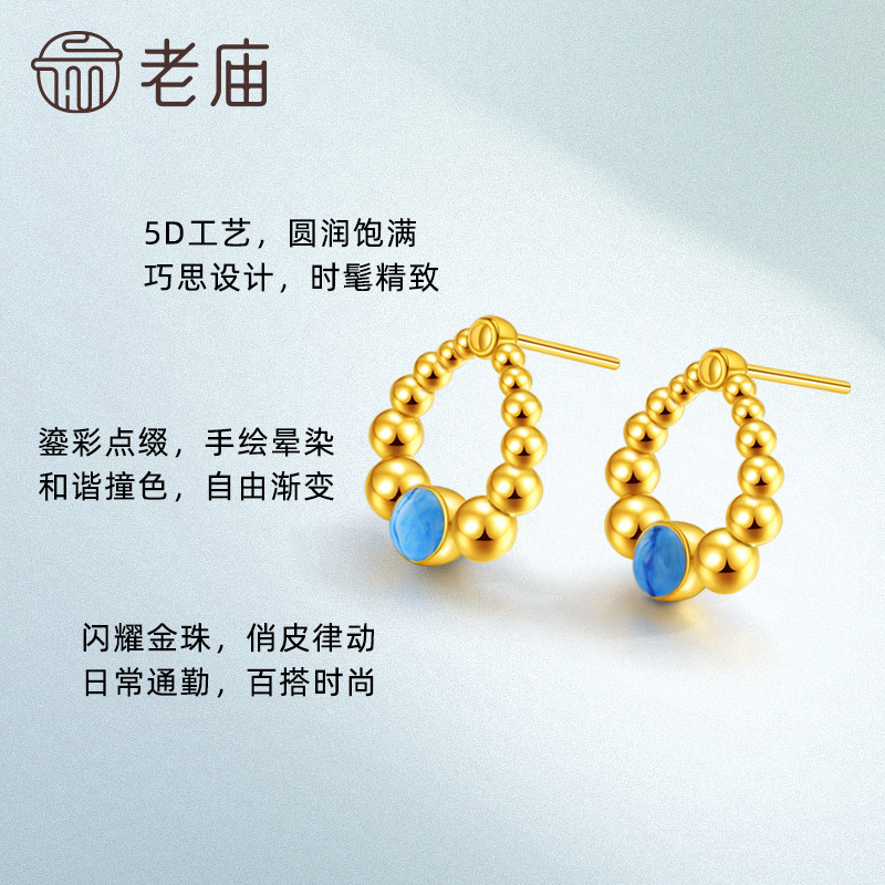 老庙黄金足金鎏彩不规则耳钉金珠律动系列5D工艺手绘晕染撞色蓝