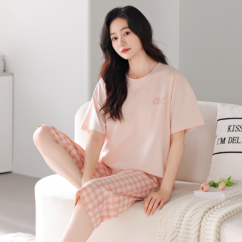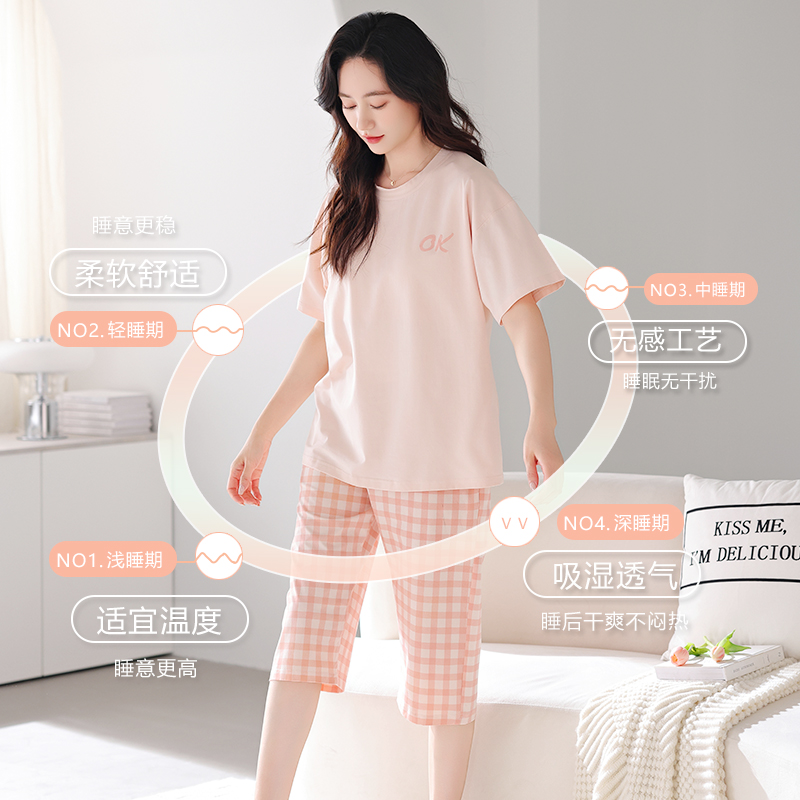 睡衣女款2025新款夏季纯棉布料100全棉短袖七分裤简单家居服夏天