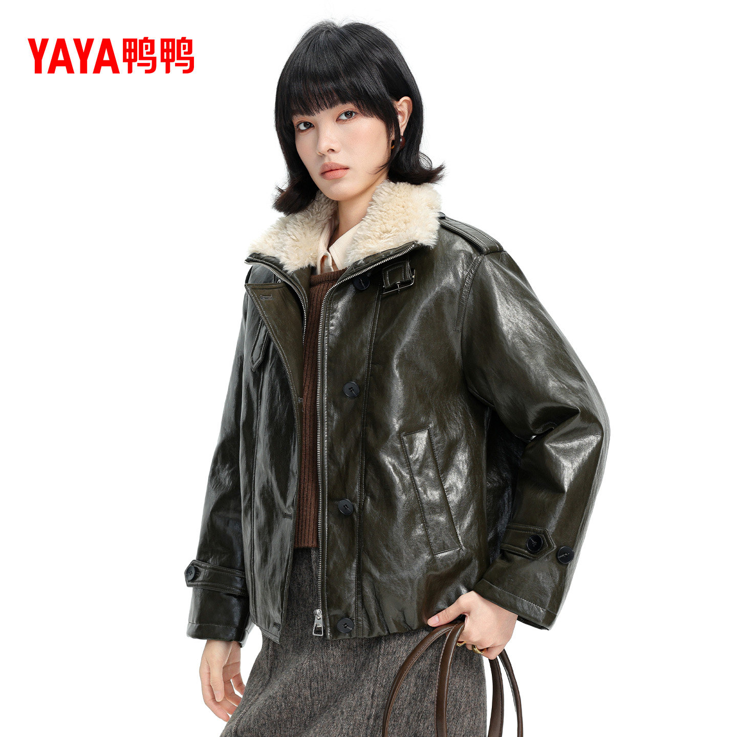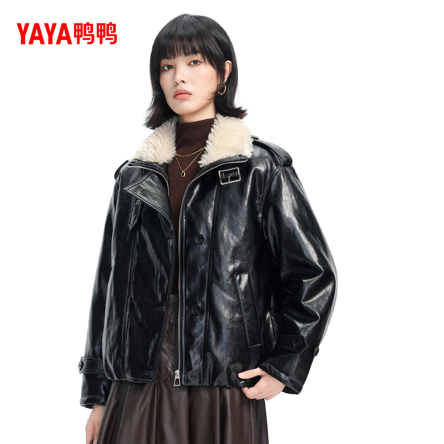 鸭鸭皮衣羽绒服女2025冬季新款时尚百搭PU皮保暖毛绒领短款外套M