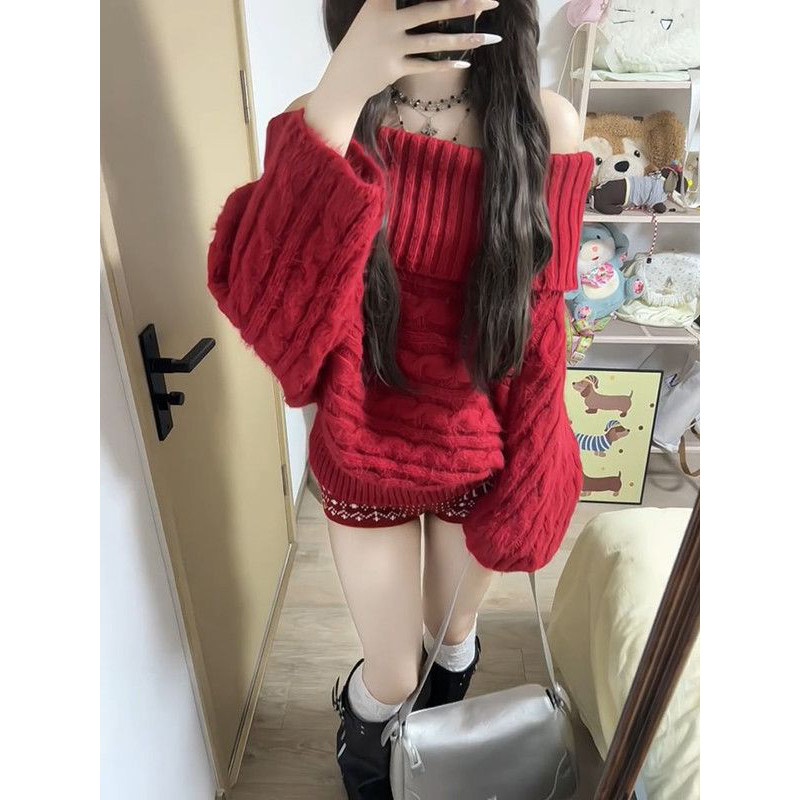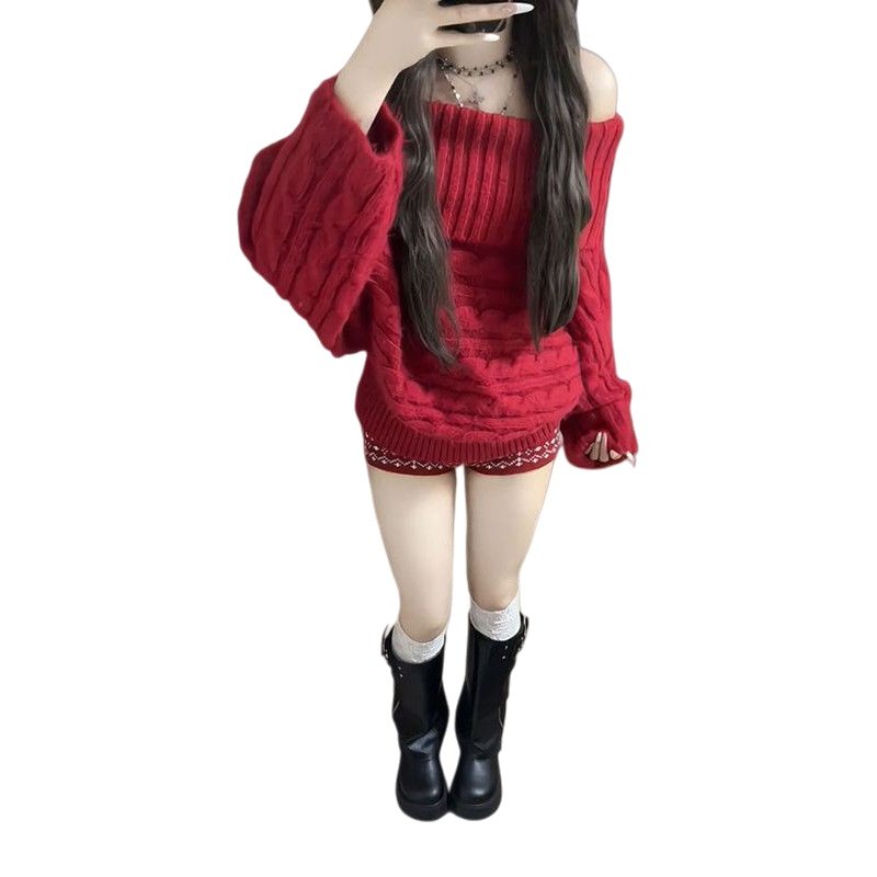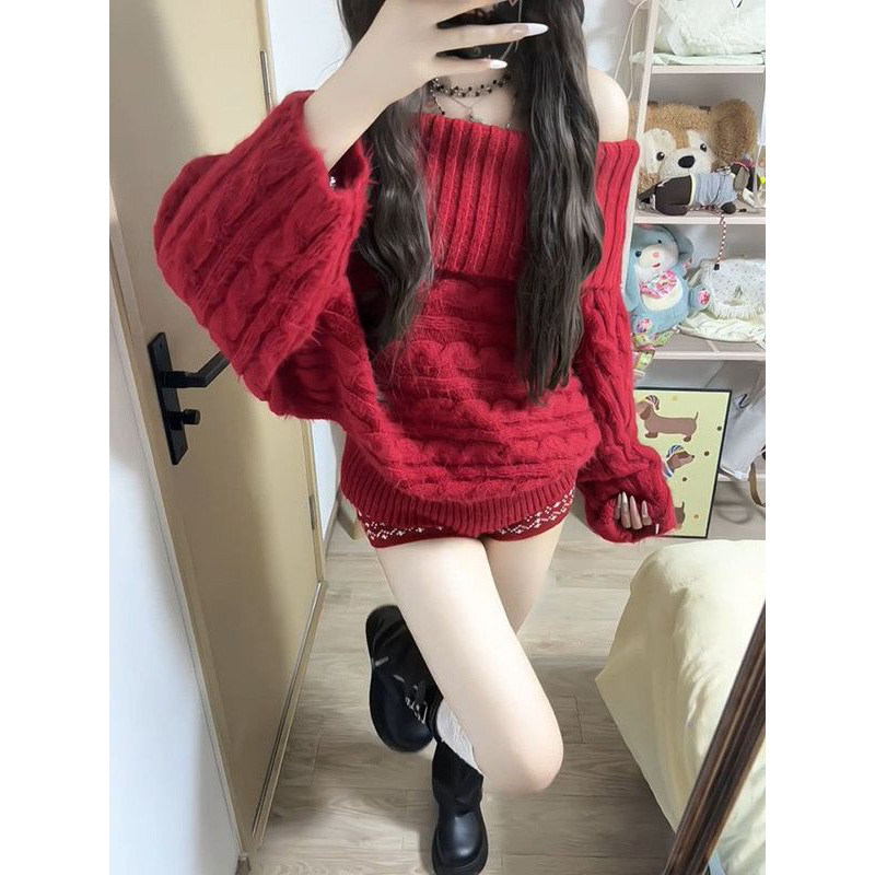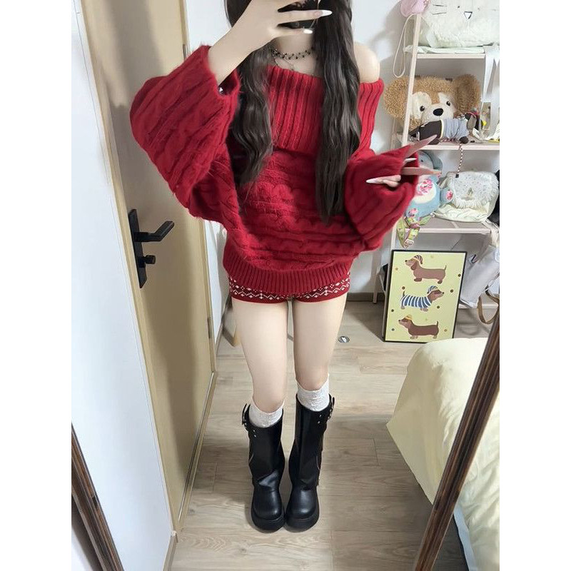 2026新款温柔巨好看圣诞套头针织毛衣+红色高腰提花短裤两件套装