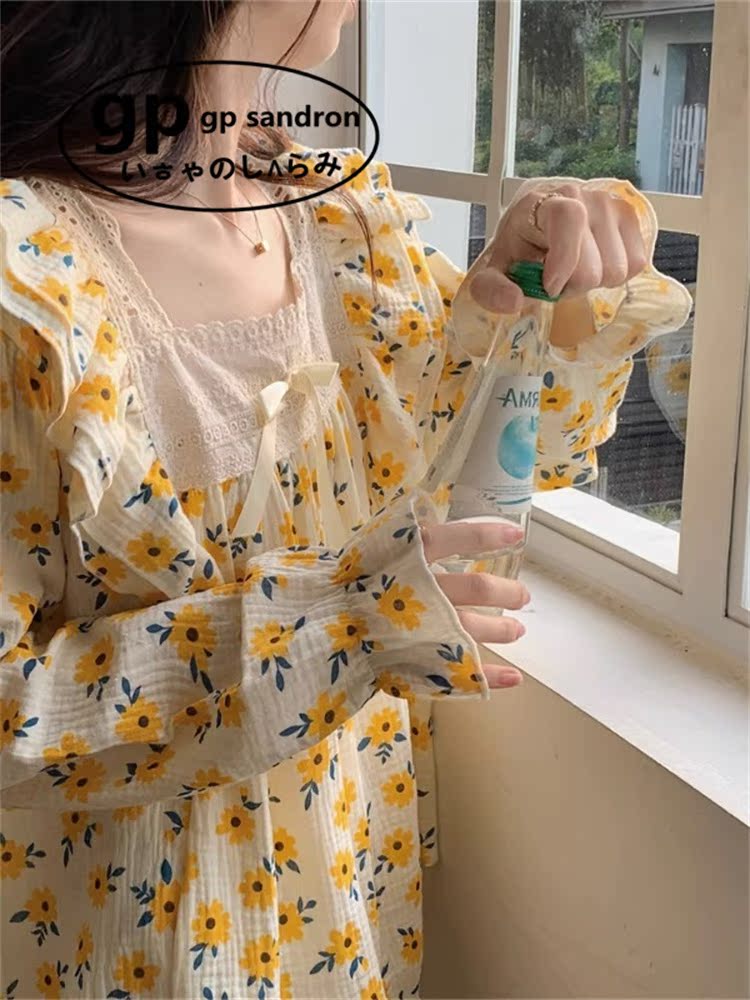 日本小众gp碎花全棉睡裙女款秋季纯棉睡衣女长袖宫廷风甜美家居服