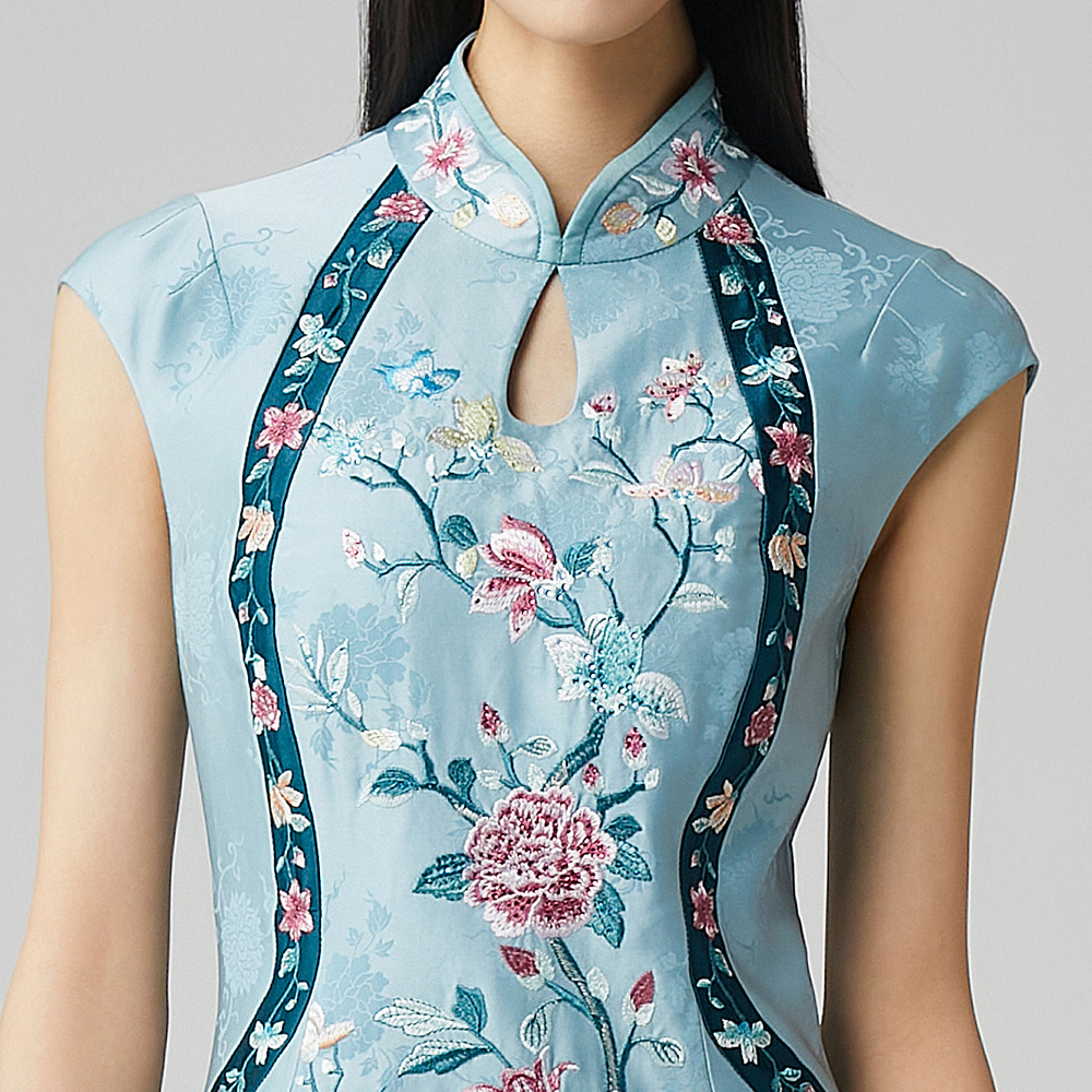 SUSSI/古色夏商场同款蓝色中国风刺绣修身包臀旗袍连衣裙女