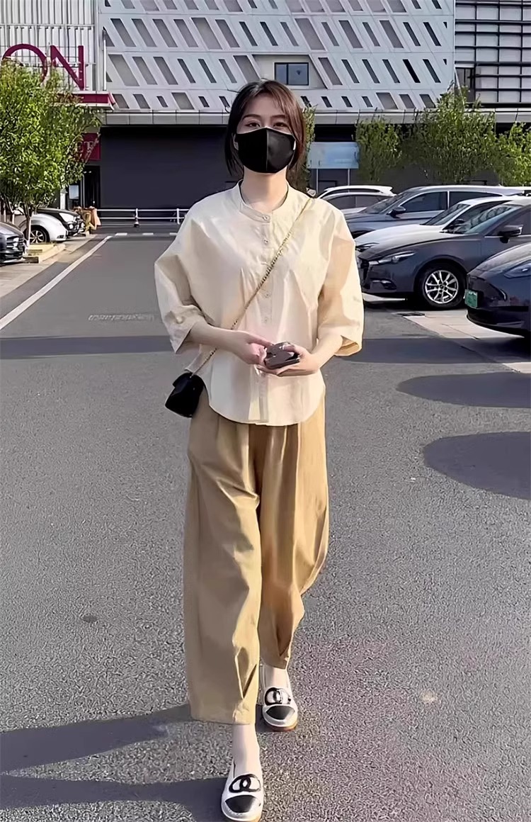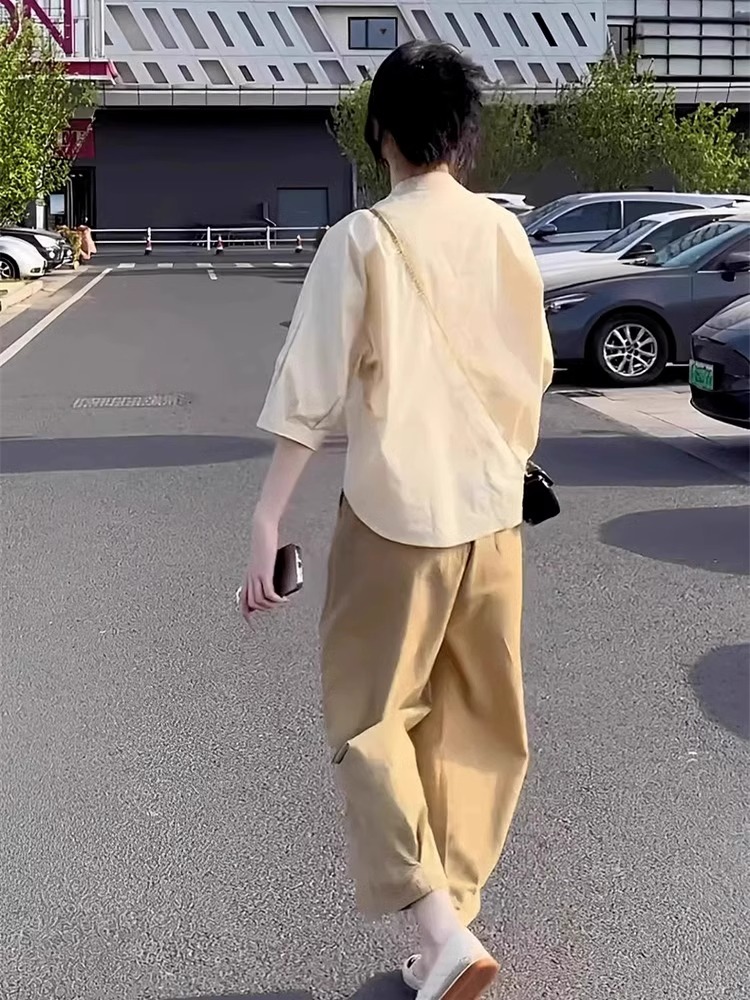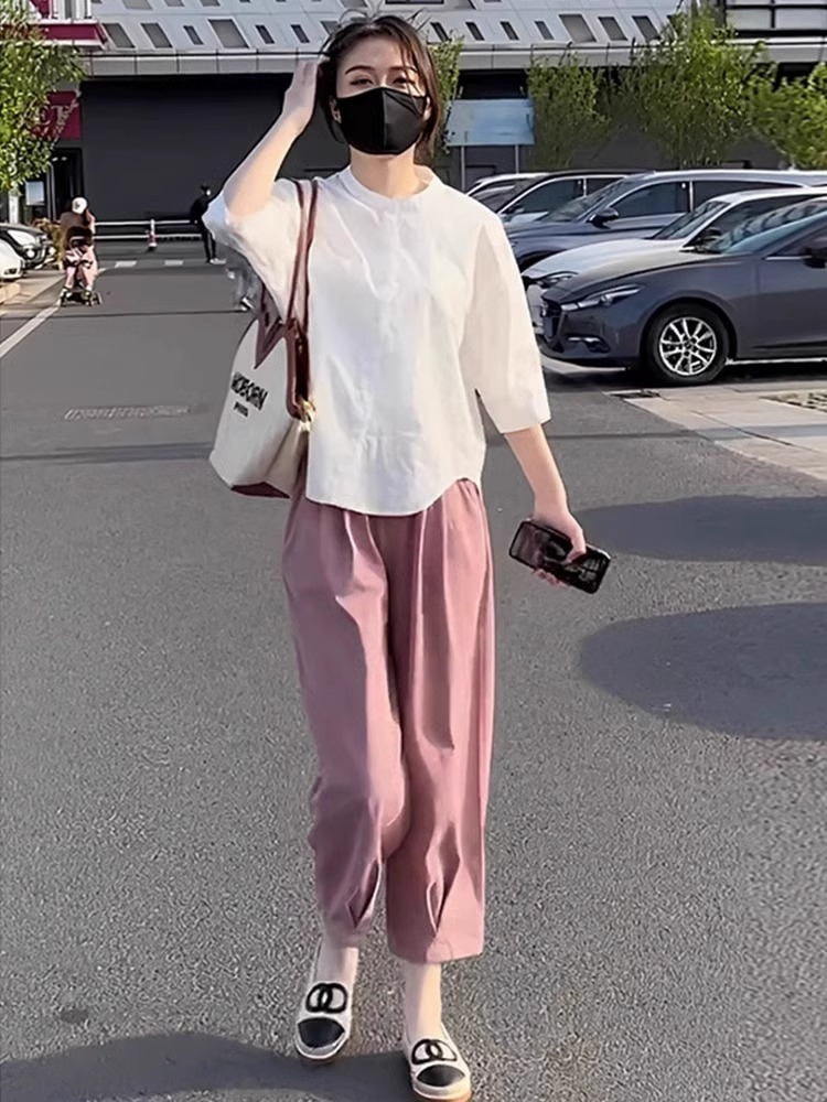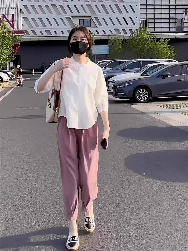 成套搭配减龄套装韩版百搭简约五分袖休闲衬衫女粉色阔腿裤两件套