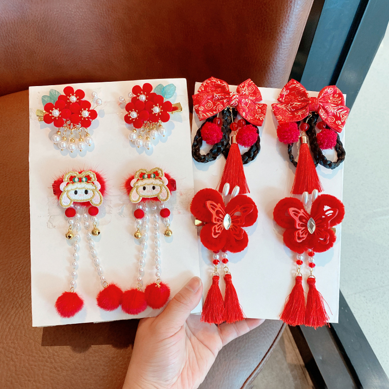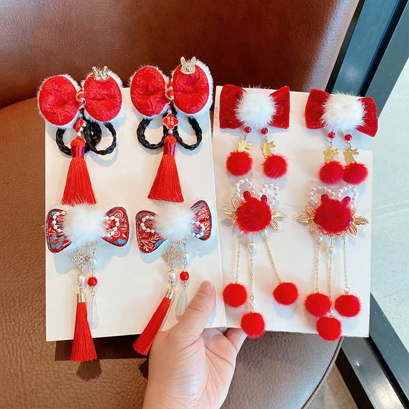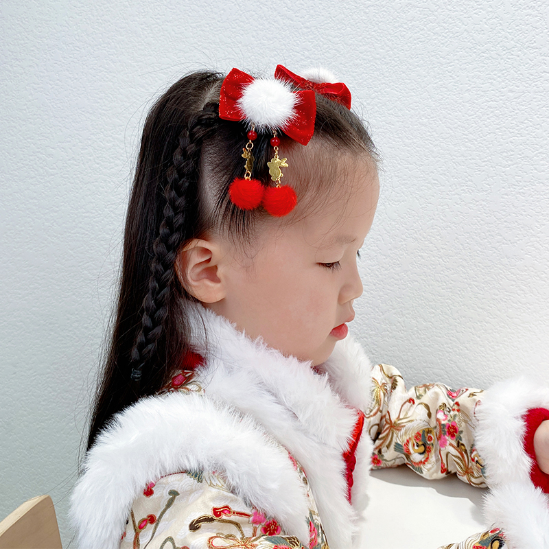 红色头饰新年儿童发夹中国风汉服发卡宝宝古风拜年毛球流苏头饰女