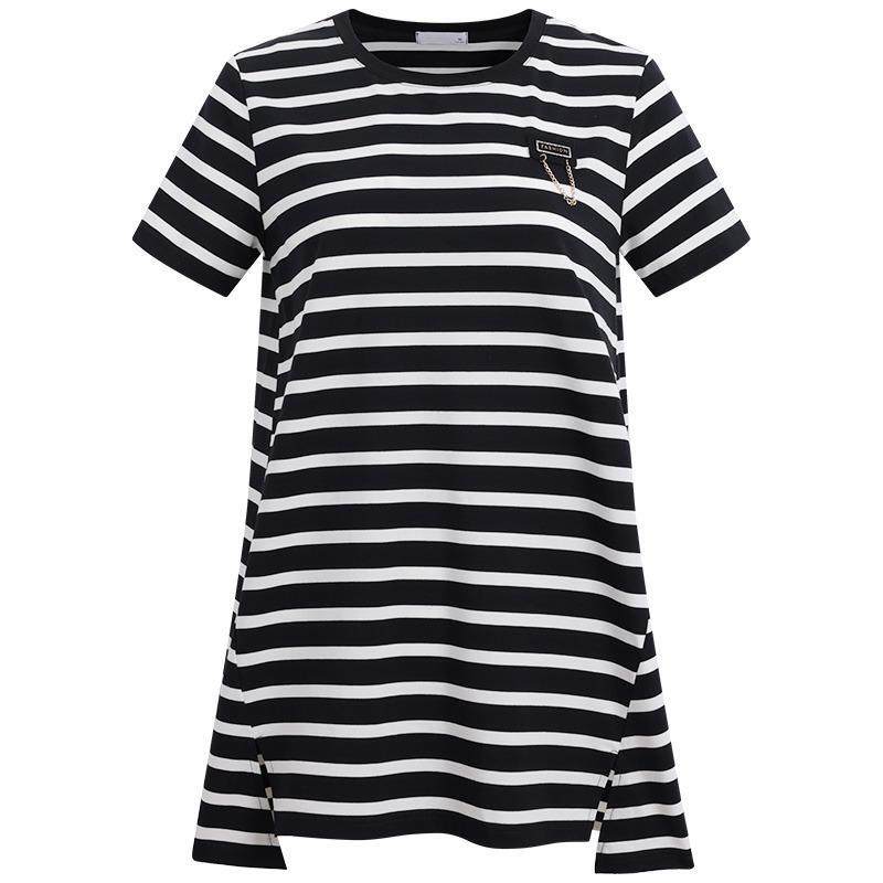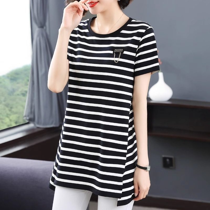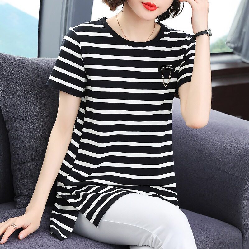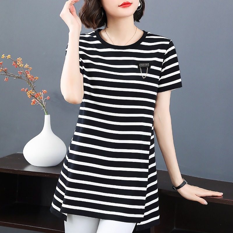 纯棉短袖t恤女装2025夏季新款条纹体恤大码胖mm中长款宽松上衣服