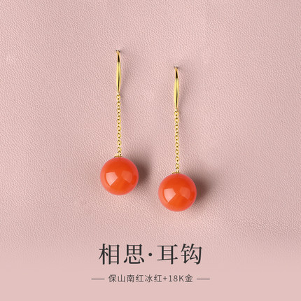 天然保山南红耳饰女18K金长款冰红单珠流苏耳坠耳链古风中式耳环