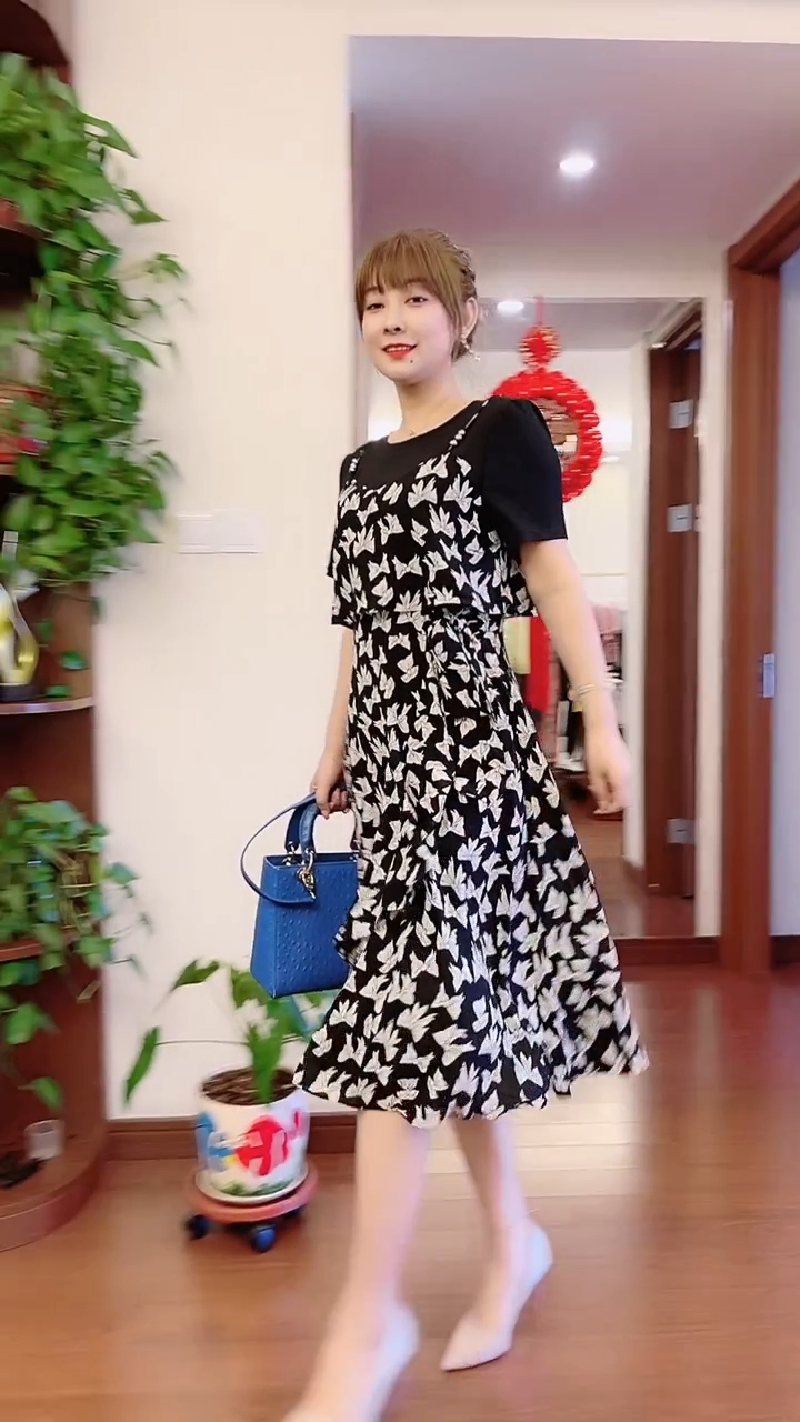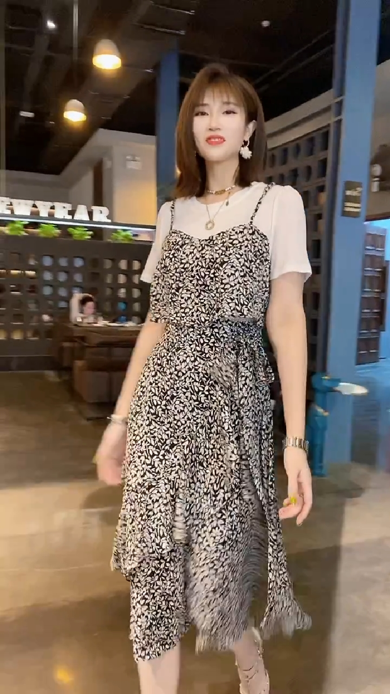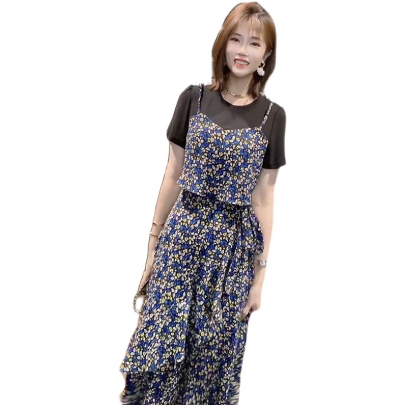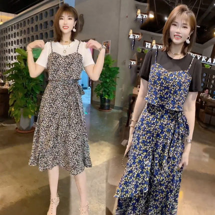 2022夏新款气质女神范设计感洋气拼接荷叶边高腰假两件碎花连衣裙