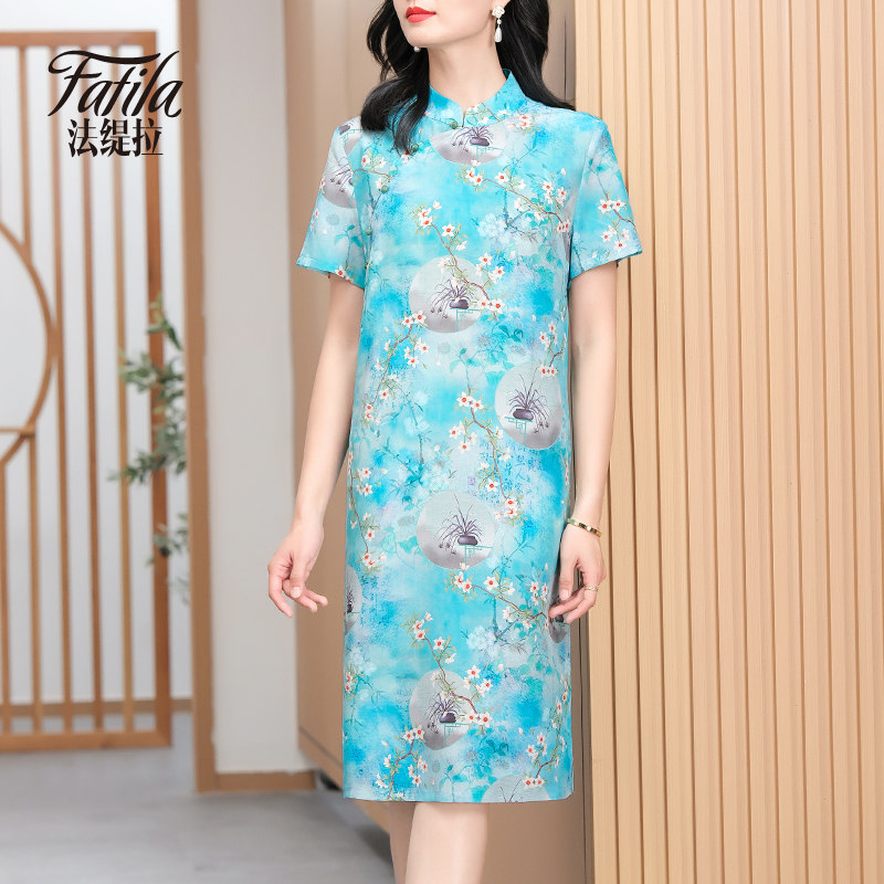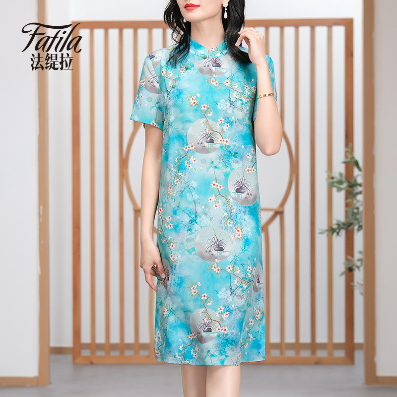 中年妈妈重磅真丝连衣裙女夏季新款显瘦印花桑蚕丝裙子旗袍改良版