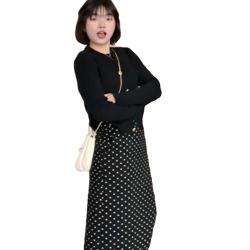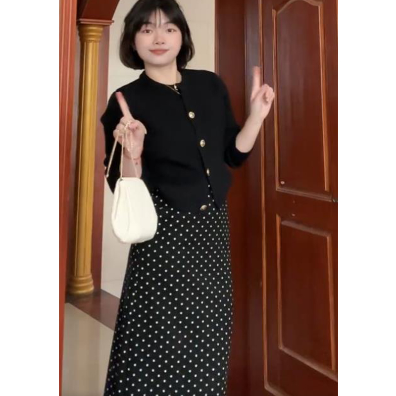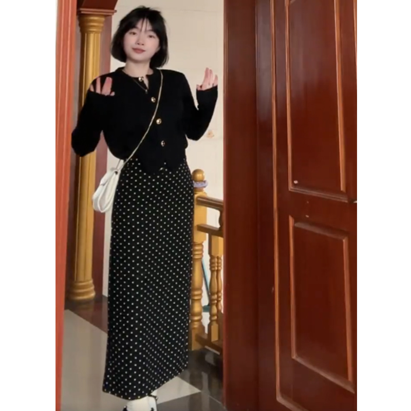 大码胖mm小香风套装女简约针织开衫搭配波点半身裙盐系轻熟两件套