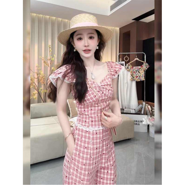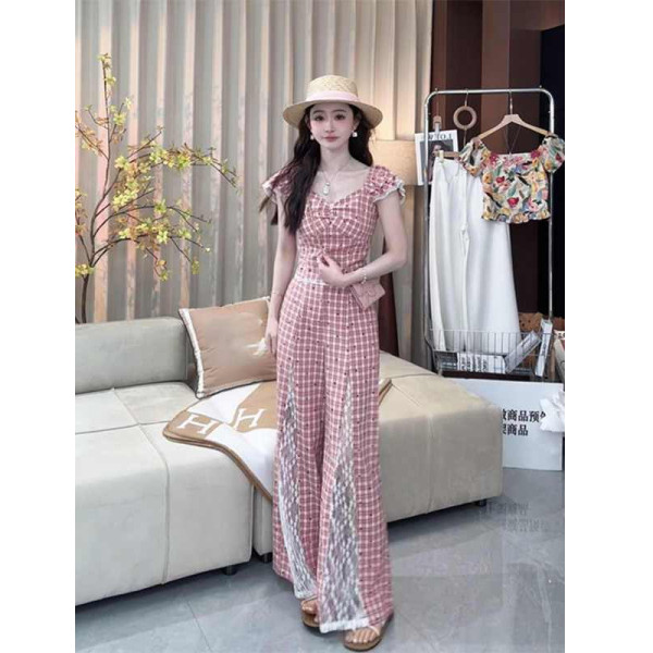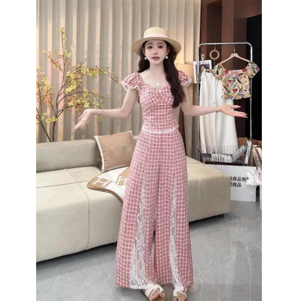 大码胖mm甜美休闲风套装女夏季格子短袖上衣蕾丝拼接阔腿裤两件套
