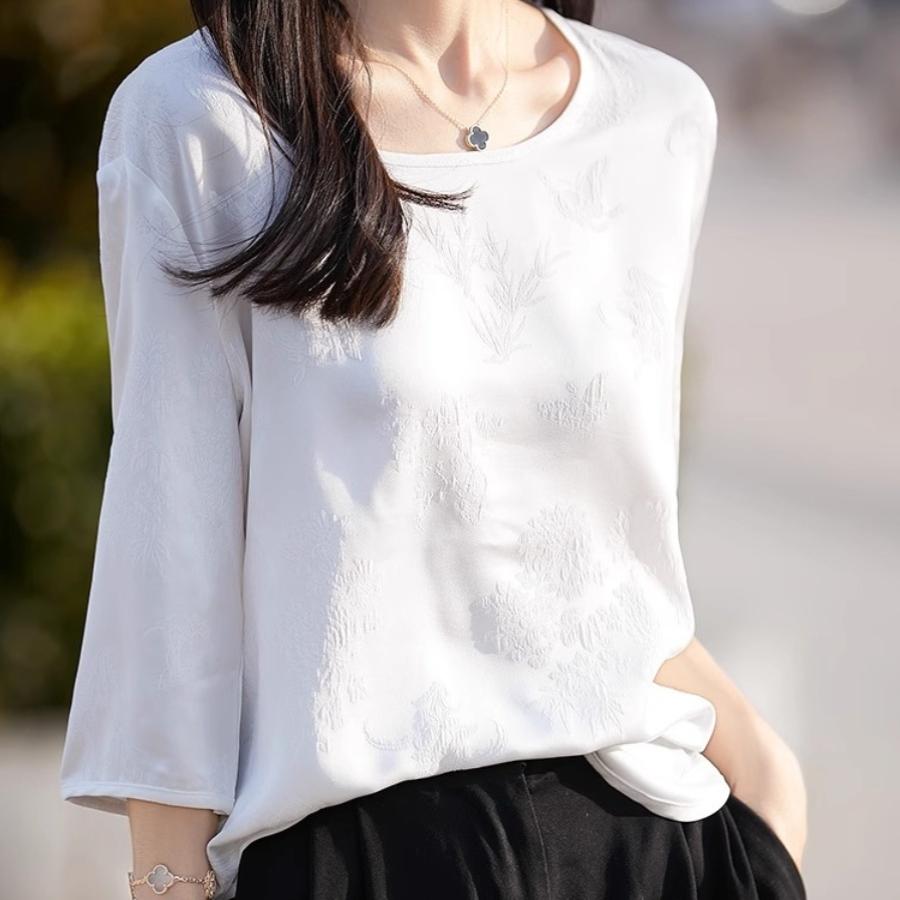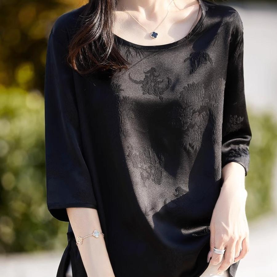 提花缎面圆领新中式衬衫真丝短袖国风桑蚕丝衬衣女宽松垂感上衣