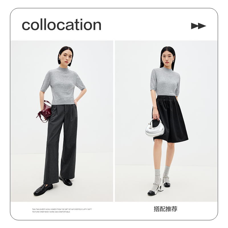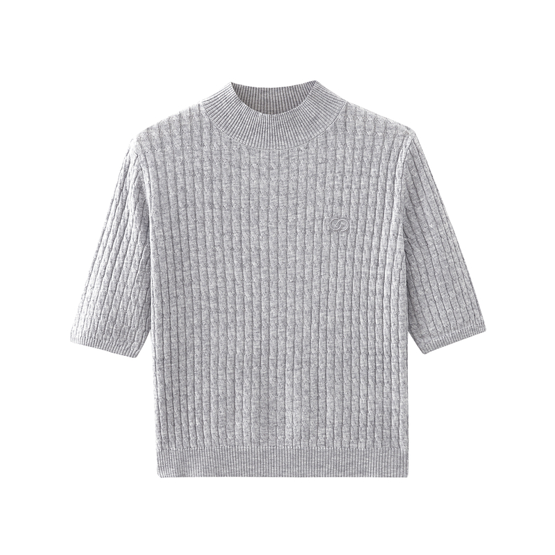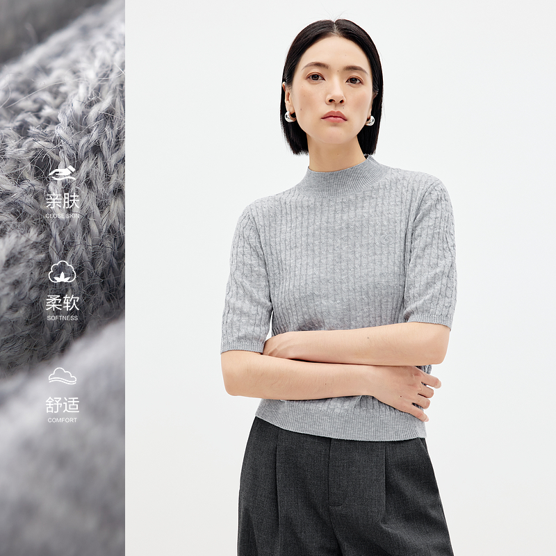 水云间灰蓝色绞花毛针织衫短袖T恤女装正肩半袖上衣2025春季新款