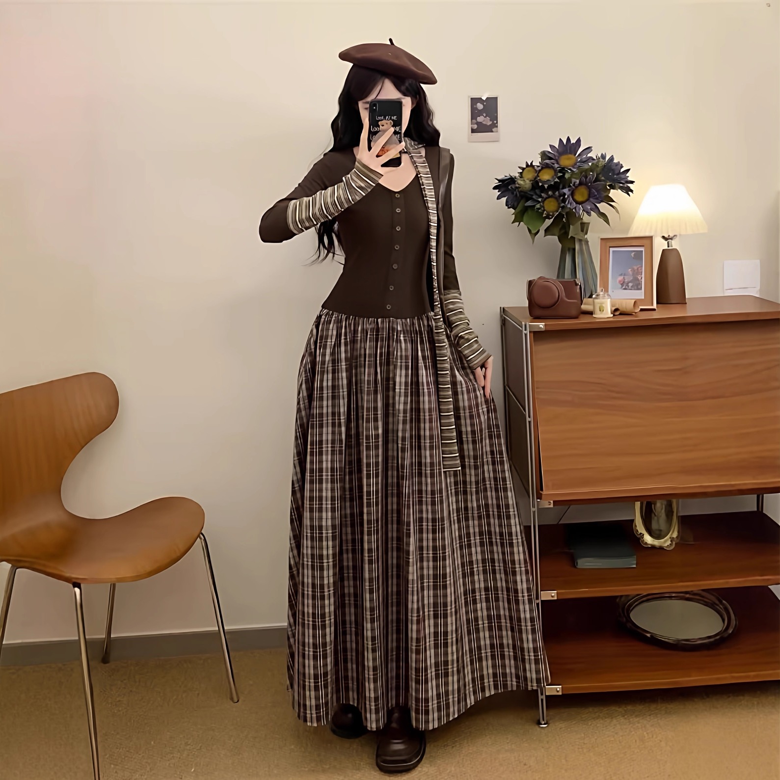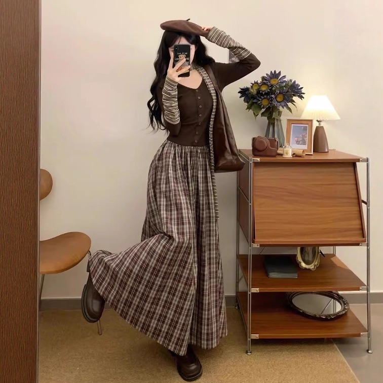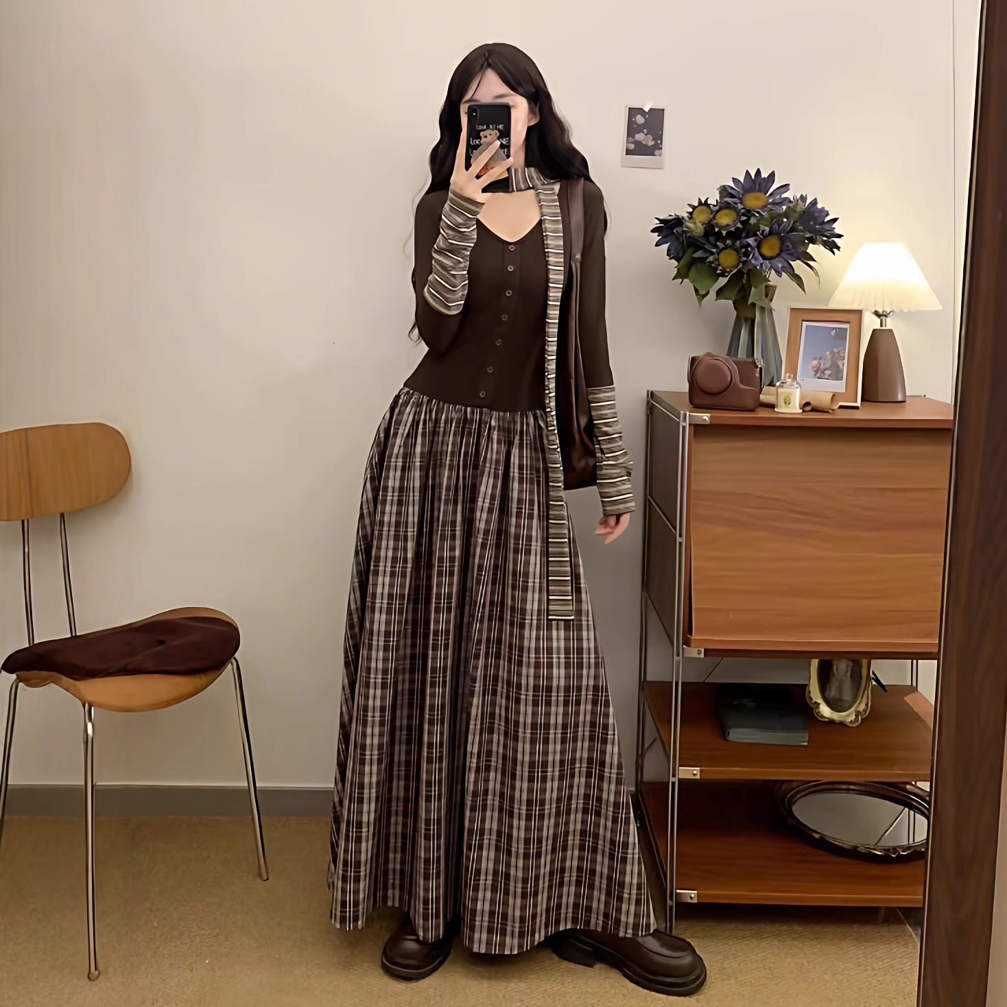 大码女装2025秋季韩系复古拼接针织假两件长袖连衣裙女胖MM显瘦裙