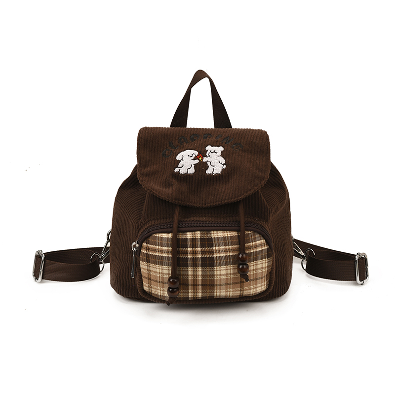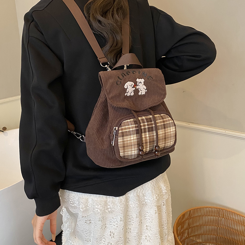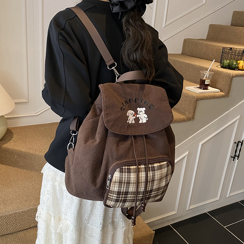 日本少女条绒布双肩包可爱卡通抽绳水桶小背包秋冬灯芯绒格纹背包