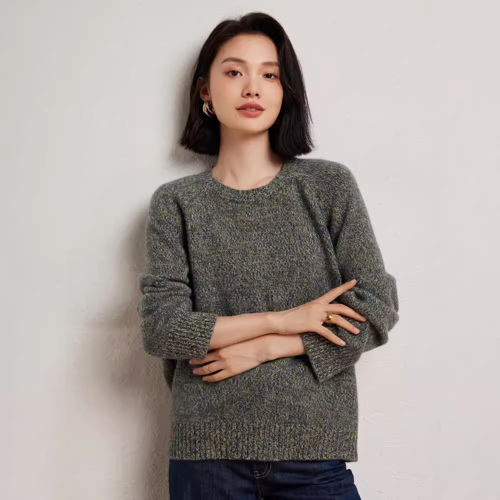 圆领羊绒衫2024秋冬新款女花纱针织打底衫韩系风宽松厚款套头毛衣