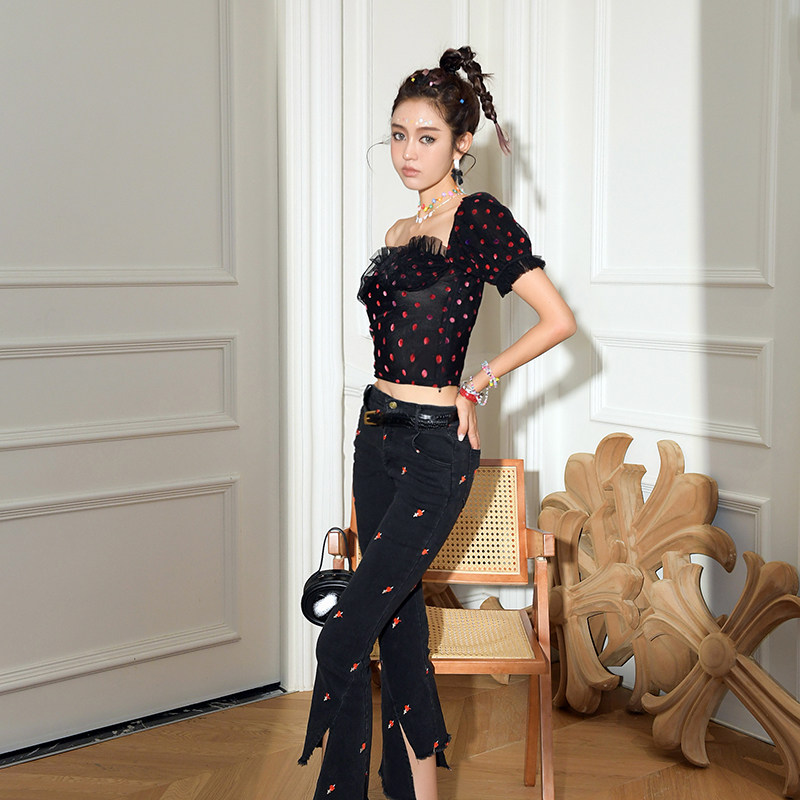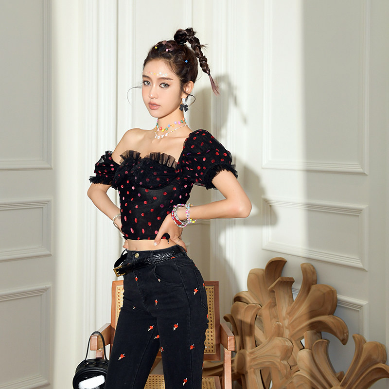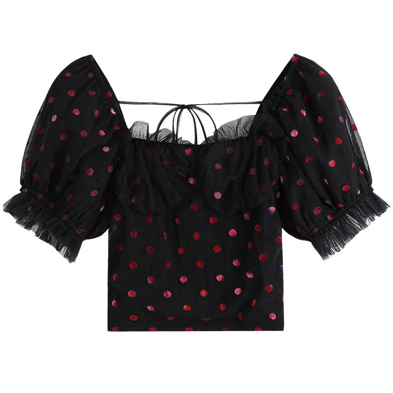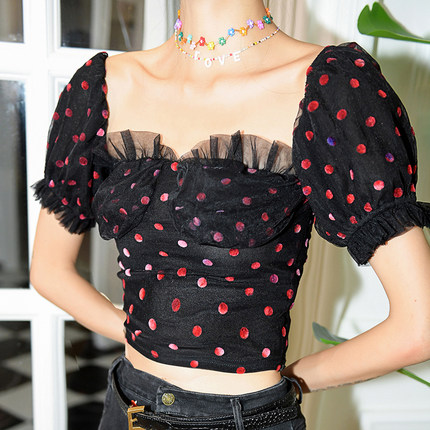 Forevercan法式复古方领波点雪纺衫女夏季泡泡袖短款修身锁骨上衣