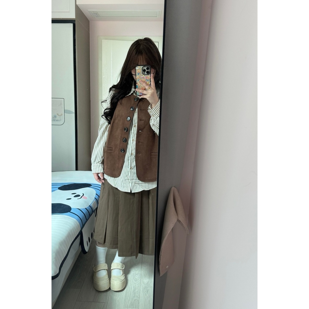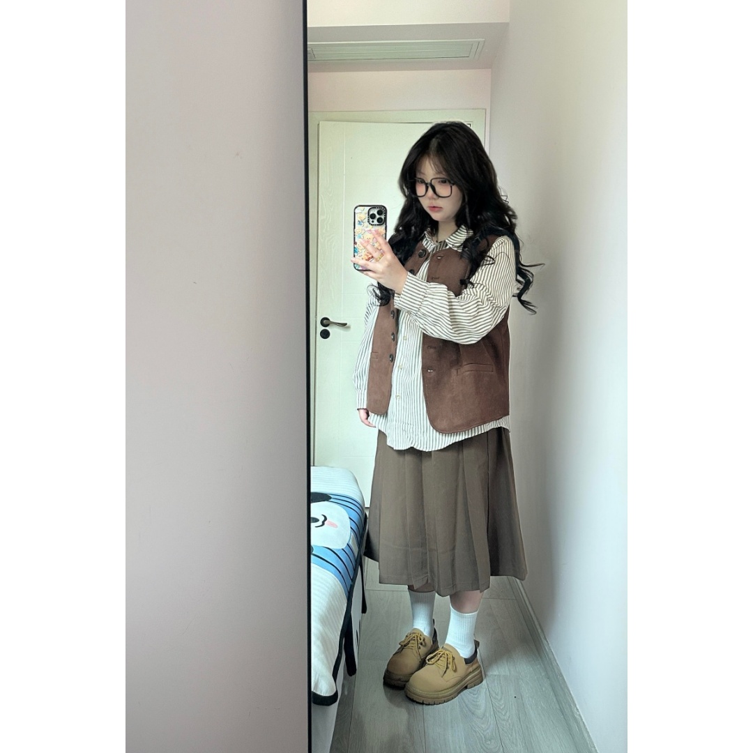 早秋新款一整套日系学院风复古开衫马甲+长袖条纹衬衫+半身裙学生