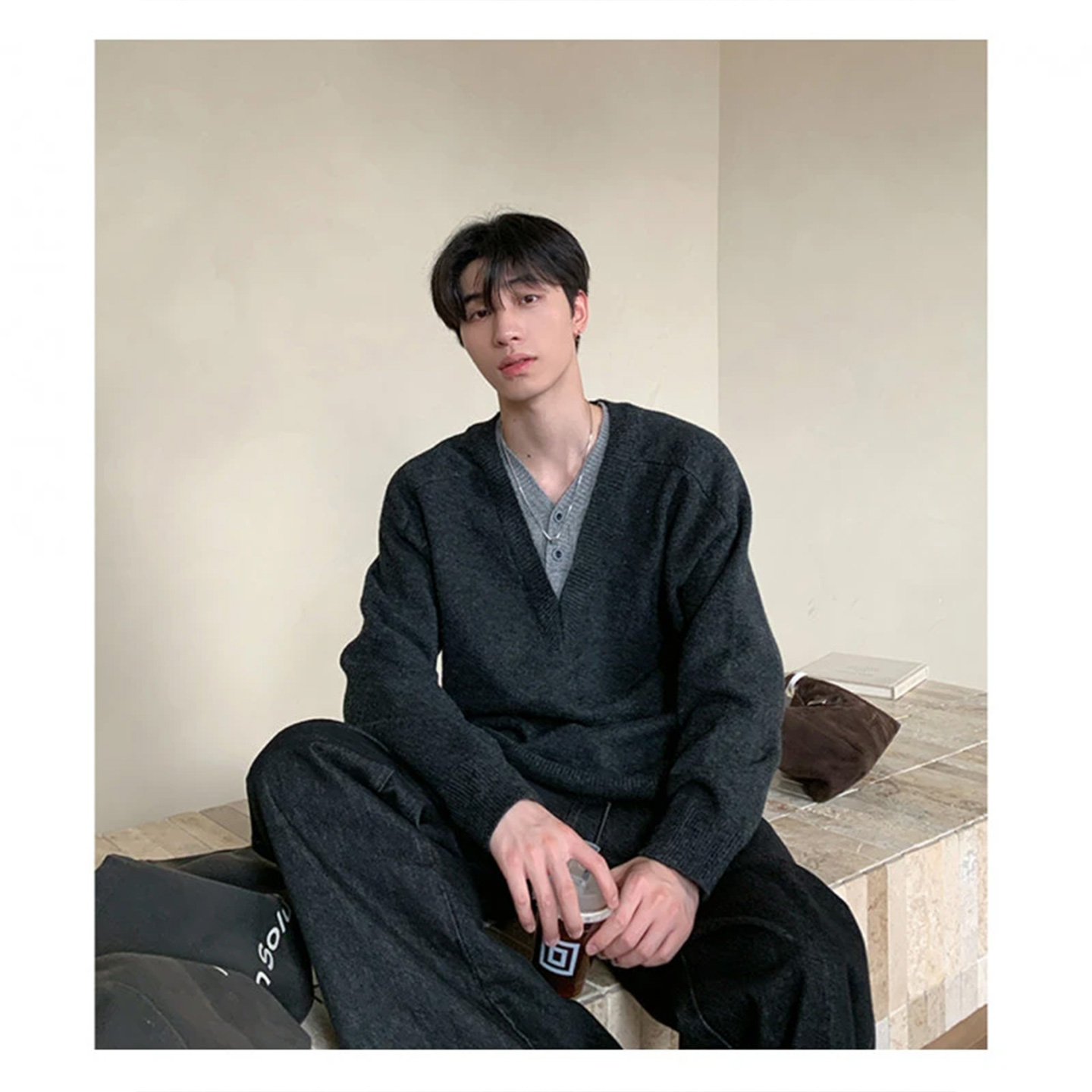 老钱风假两件设计V领毛衣男女同款慵懒感针织衫秋冬线衣套头衫潮