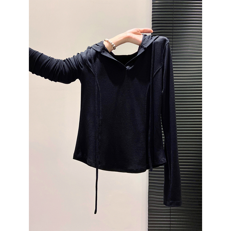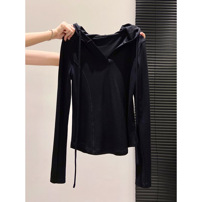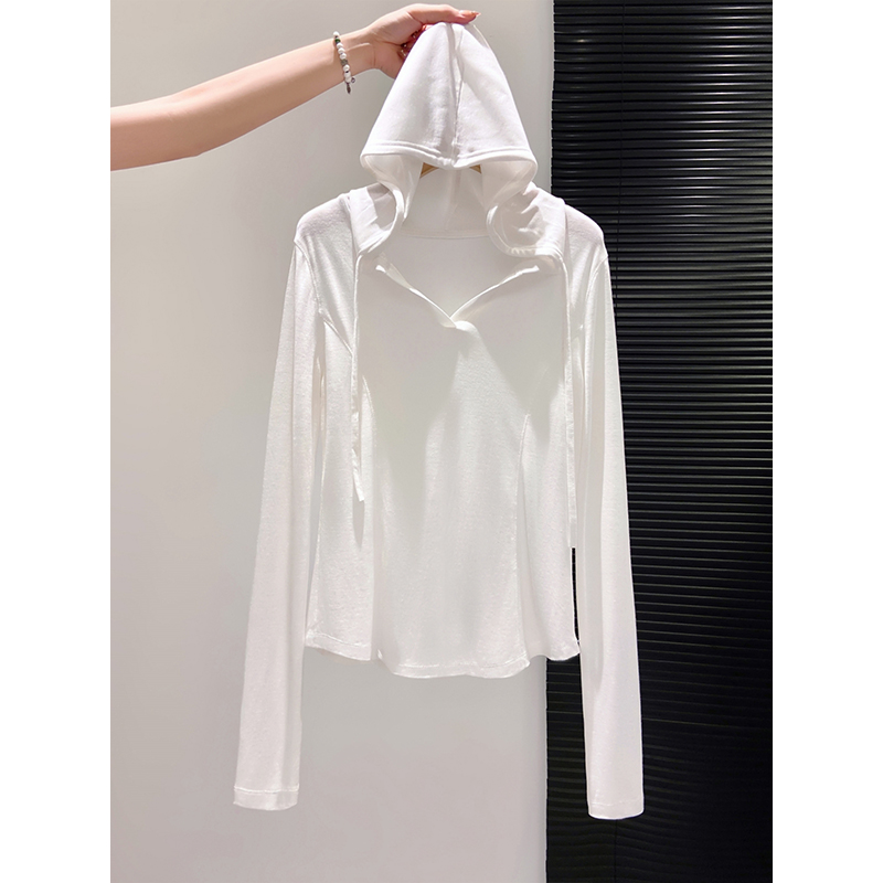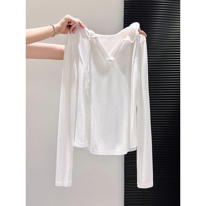 白色连帽V领长袖t恤女外穿早秋修身显瘦简约风内搭打底衫短款上衣