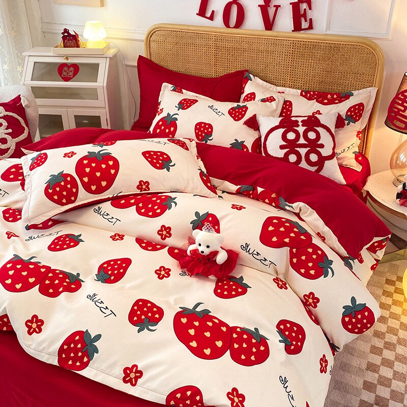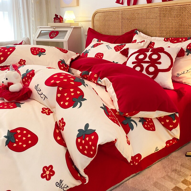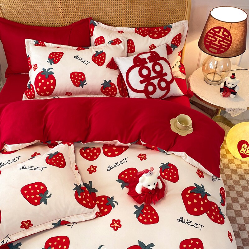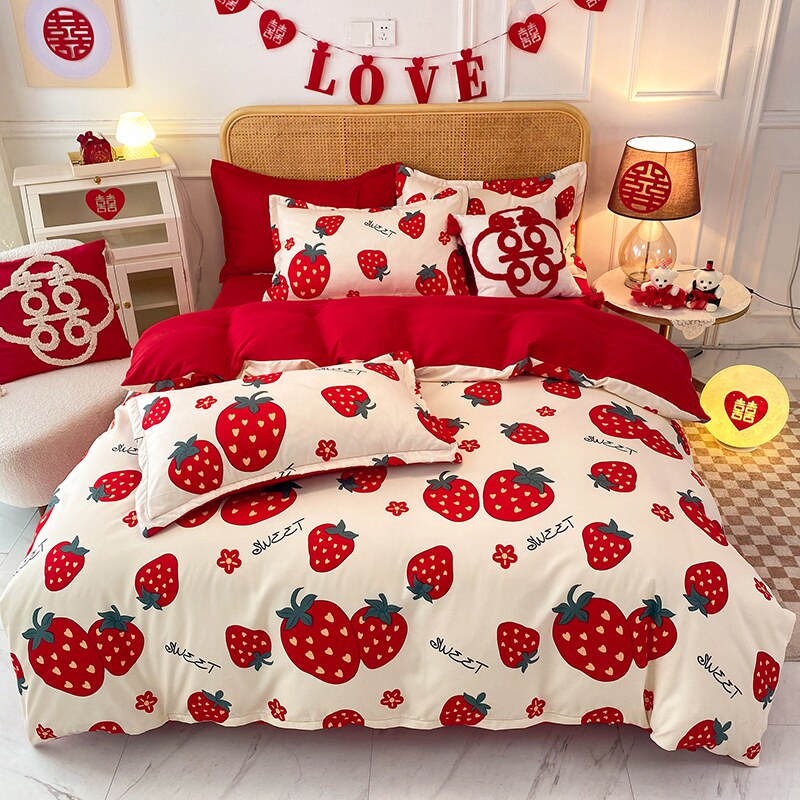 结婚四件套婚庆斜纹磨毛印花红色婚房喜被床单被罩大红色婚礼被套