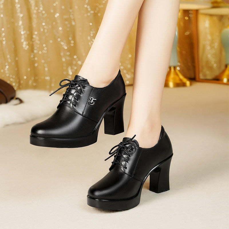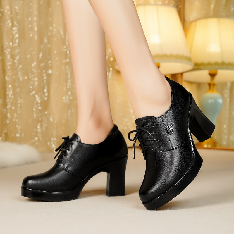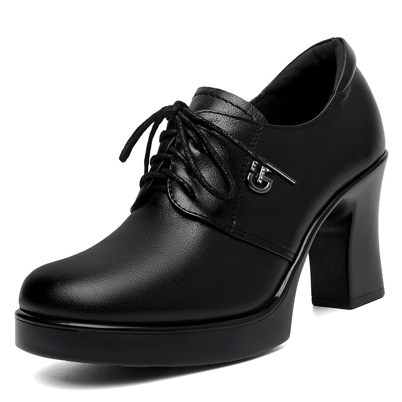 黑色皮鞋真皮系带工作女鞋高跟鞋