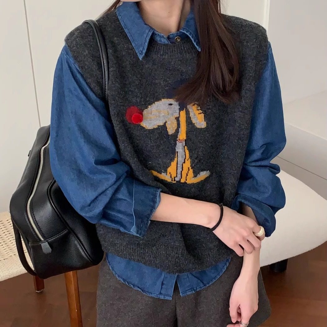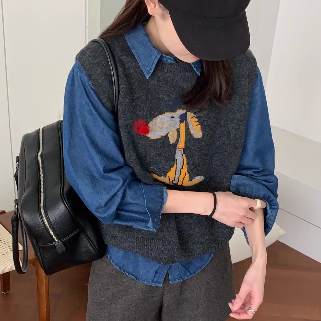 BADX正品冬季韩系洋气卡通刺绣针织背心马甲内搭牛仔衬衫两件套女