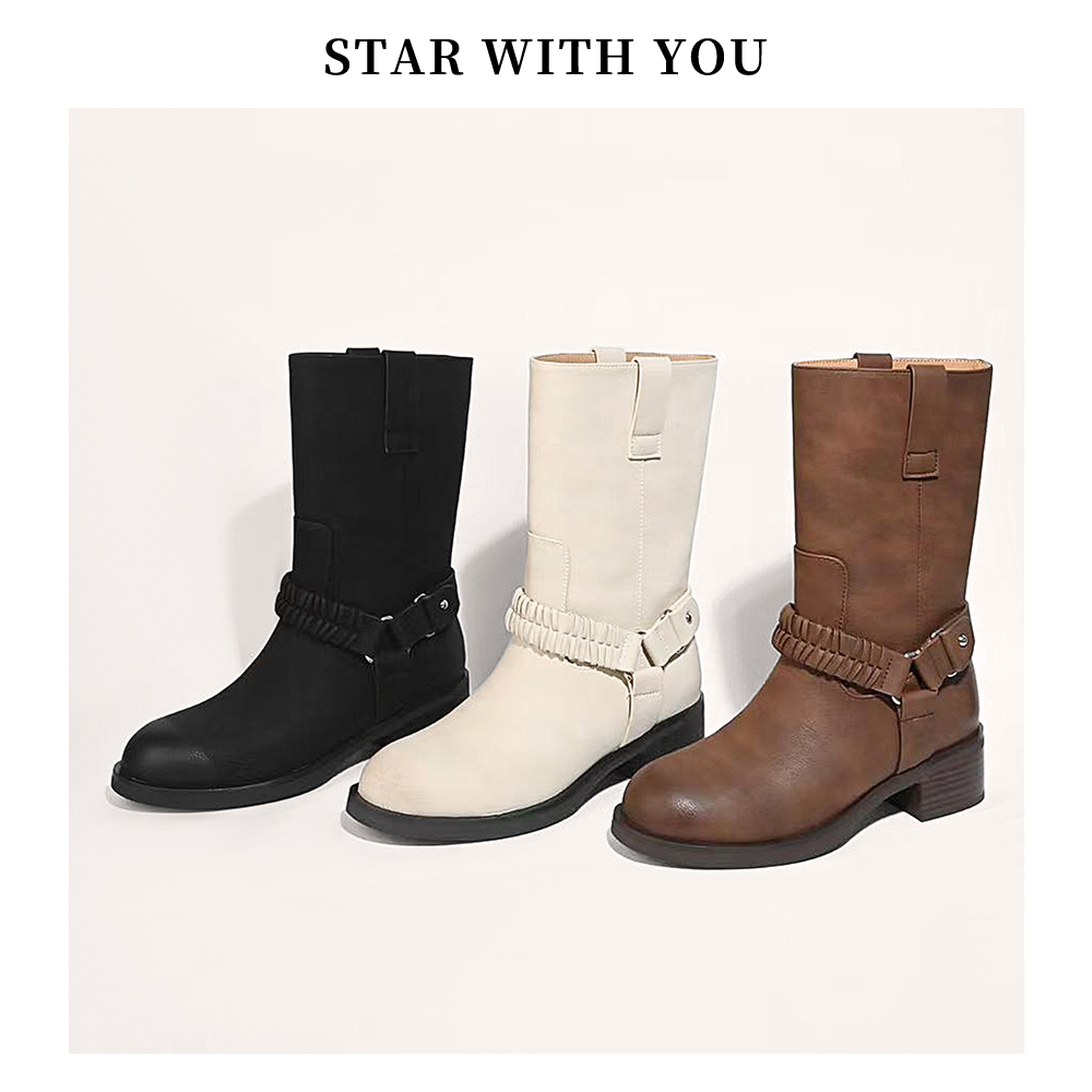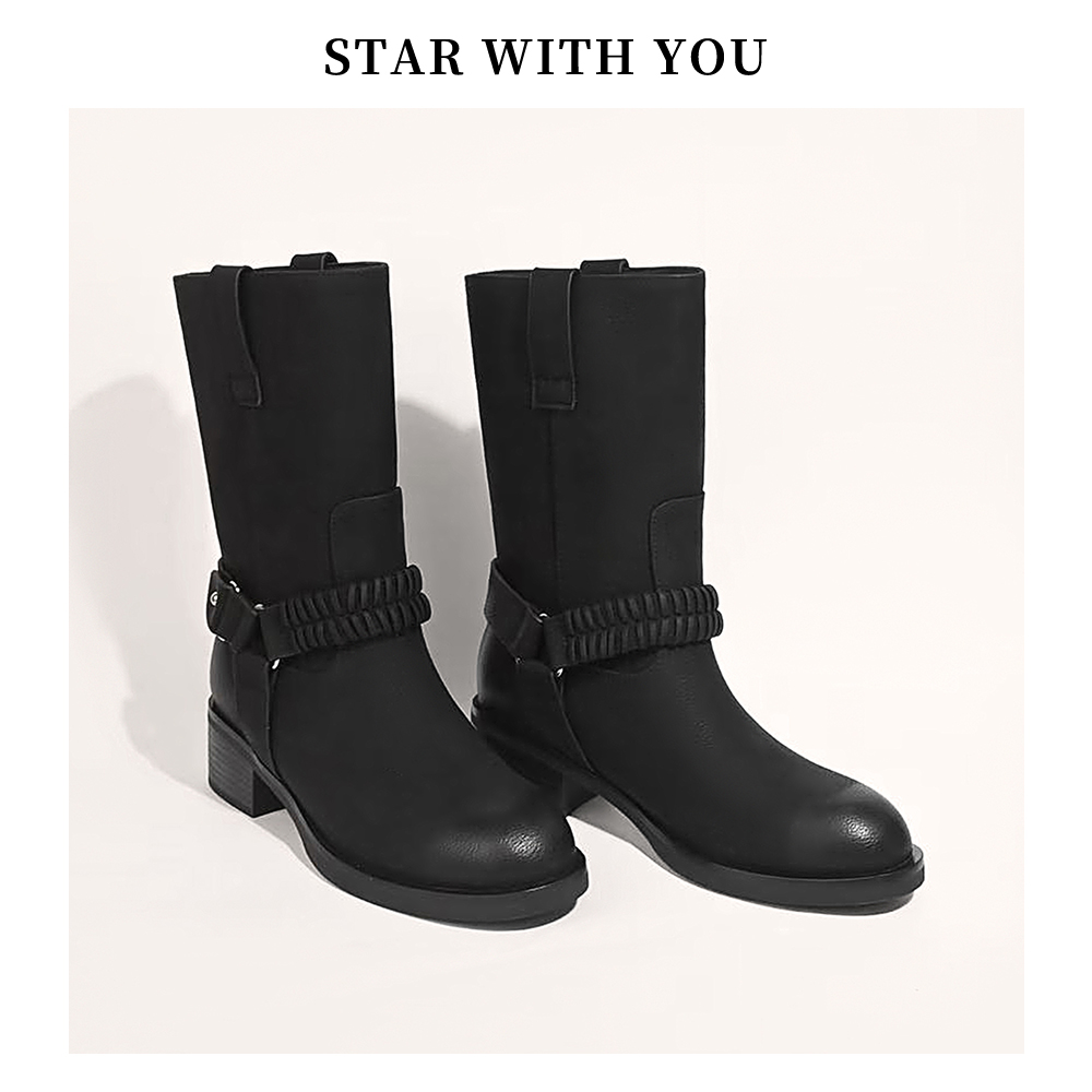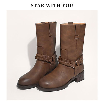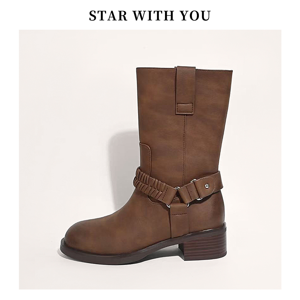 【STAR】复古擦色圆头皮带扣百搭显瘦英伦风编织带中筒骑士靴4cm
