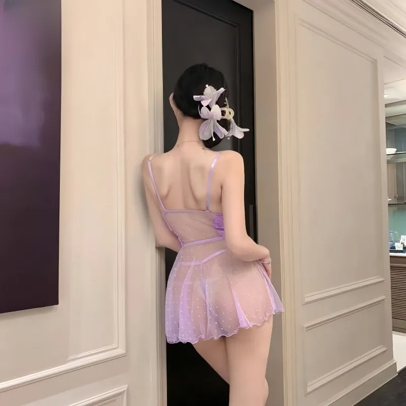 5046潮尚夜总会性感纱裙透视网纱吊带睡裙紫色透视蕾丝纯欲连衣裙