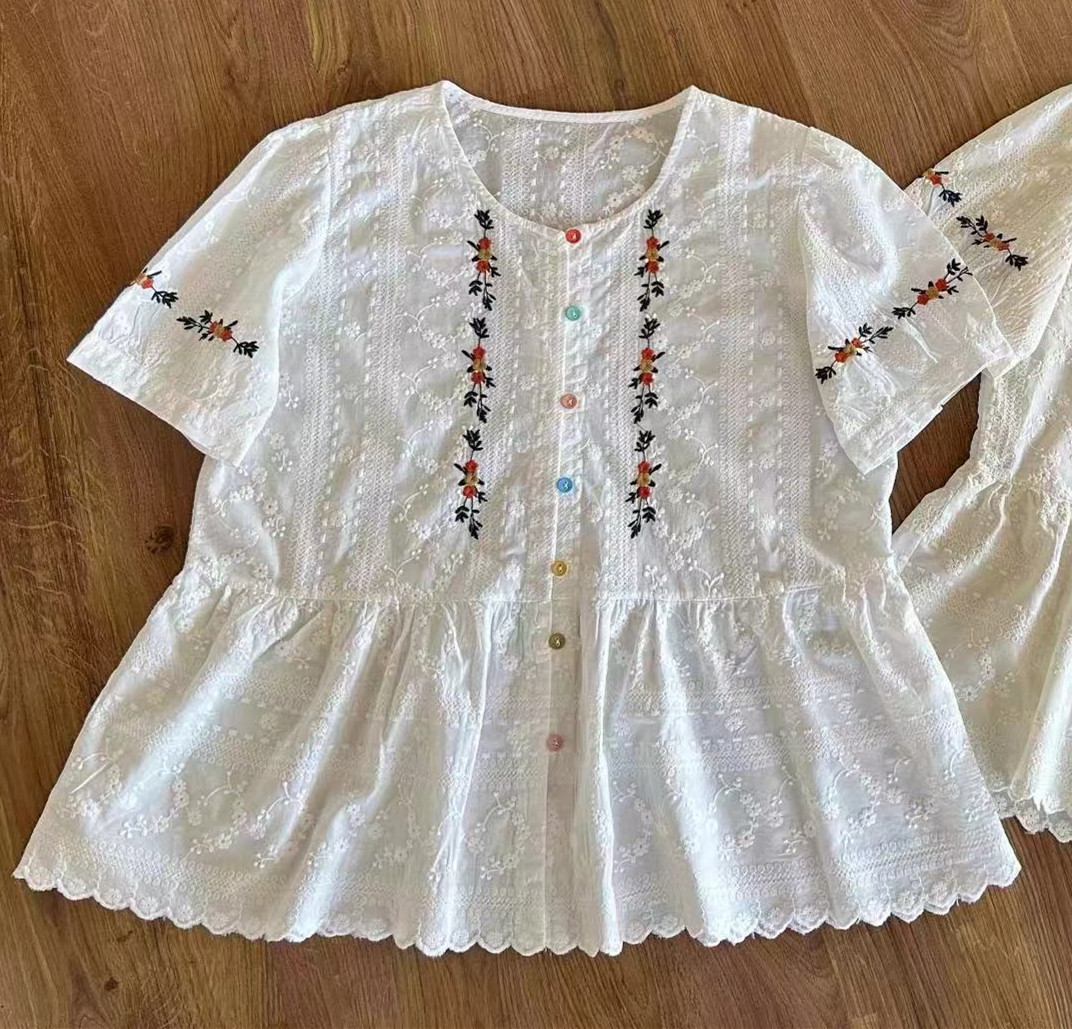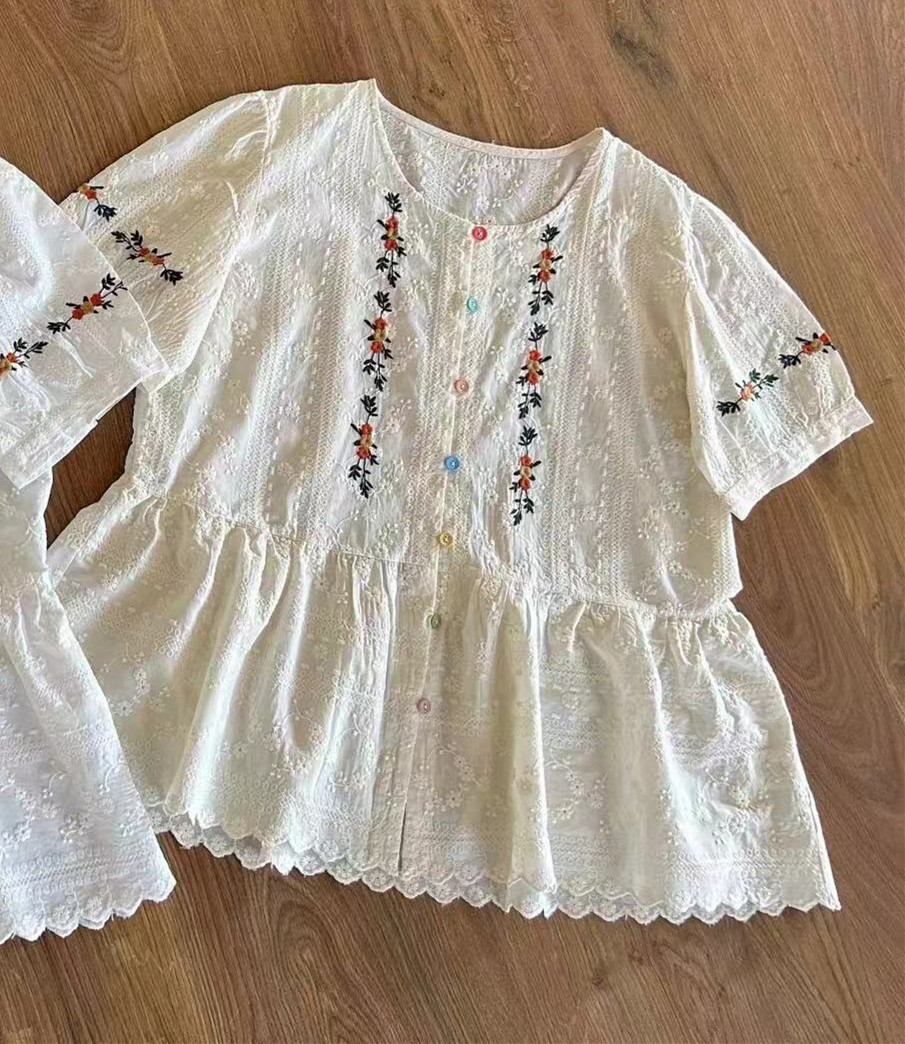 梦箱子2024夏新款清新花朵刺绣棉布衬衣圆领短袖彩扣宽松绣布衬衫