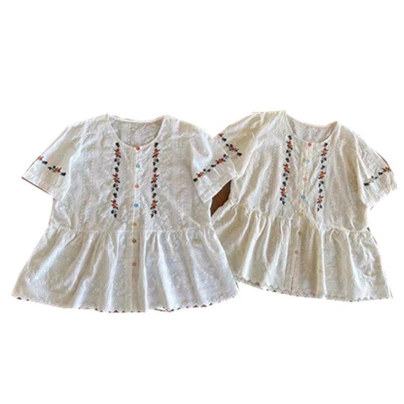 花朵刺绣圆领短袖彩扣绣布衬衫