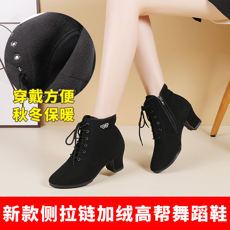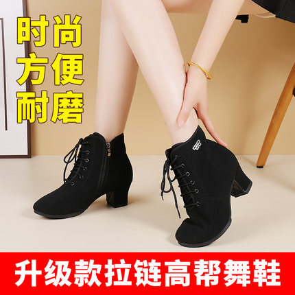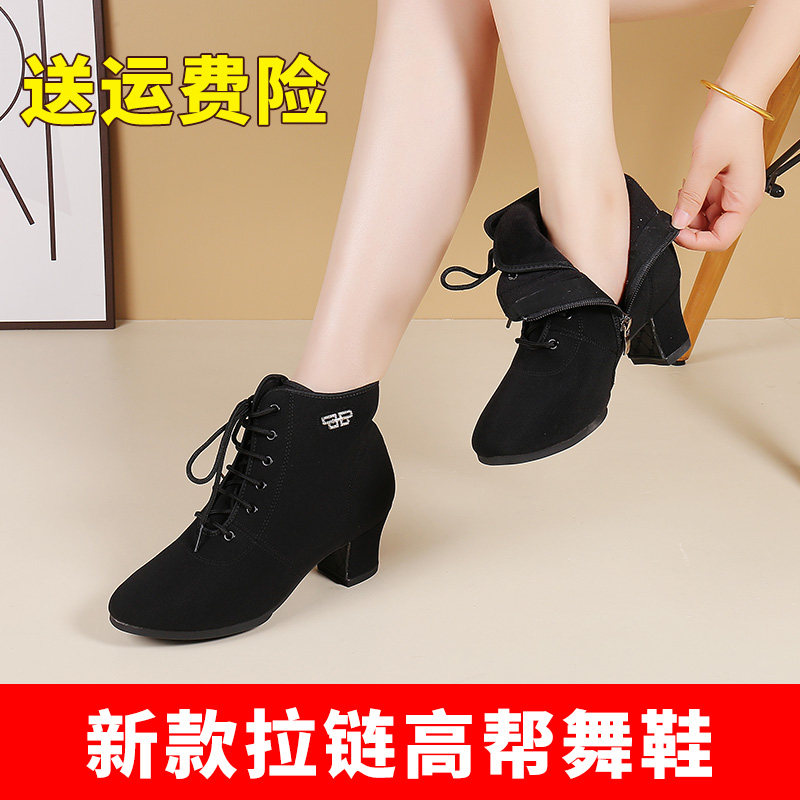 吾不凡秋冬季新款拉链高帮牛津布舞靴女士中跟交谊舞跳广场舞蹈鞋