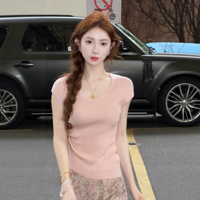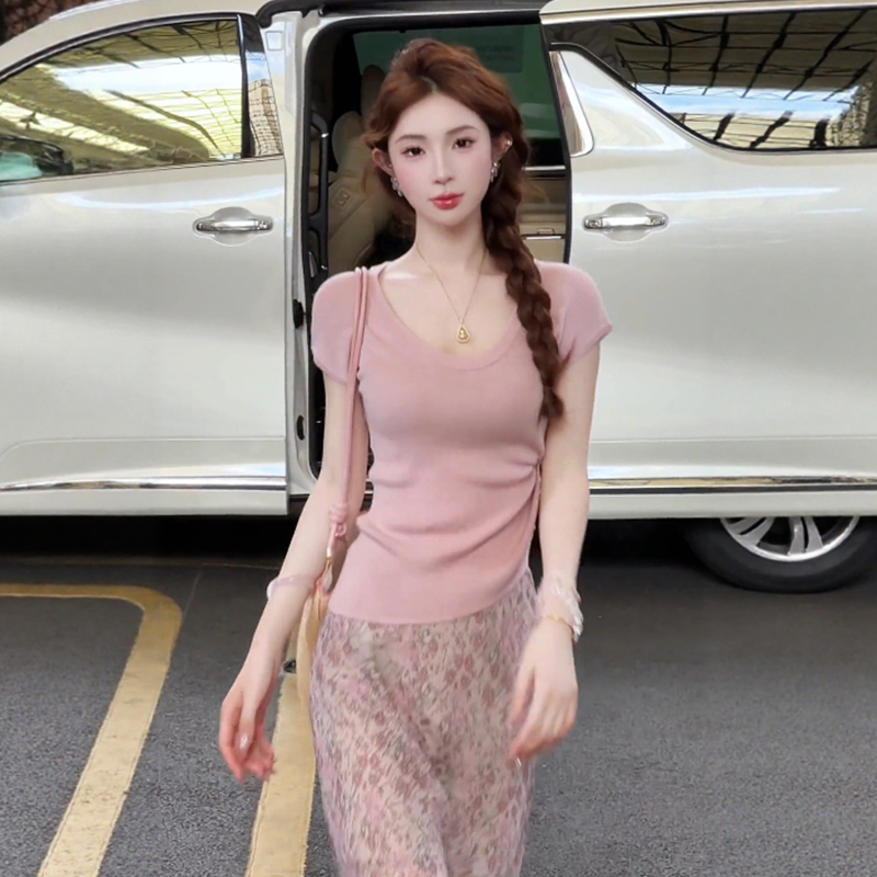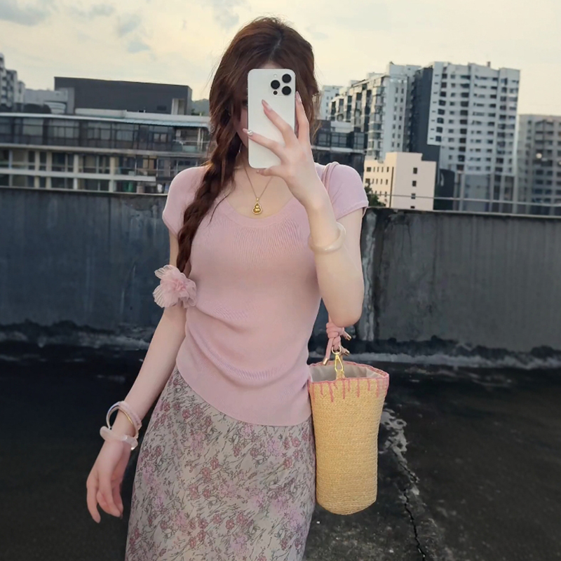 韩系甜美风粉色针织短袖碎花半身裙两件套女夏季新款温柔绝美套装