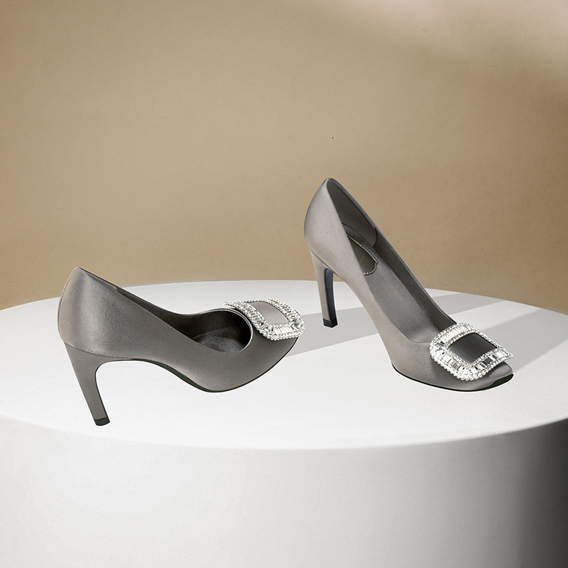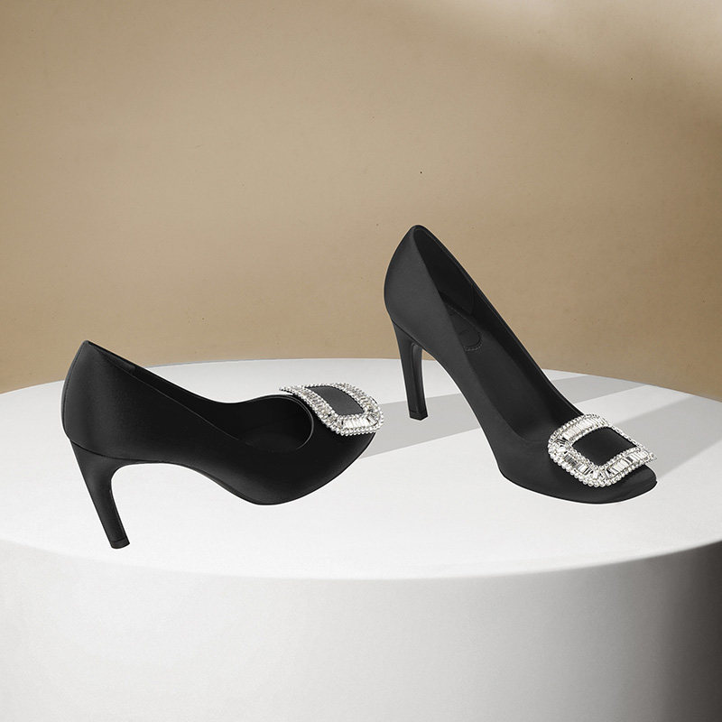 王漫妮同款RV水钻方扣高跟鞋女细跟时尚浅口真丝绸缎优雅气质单鞋