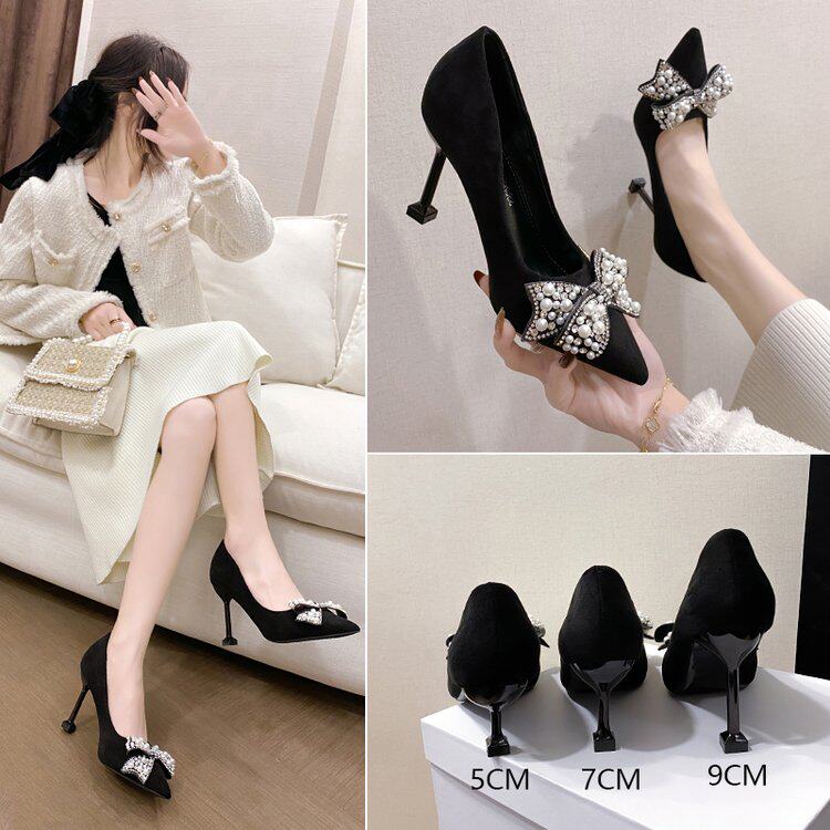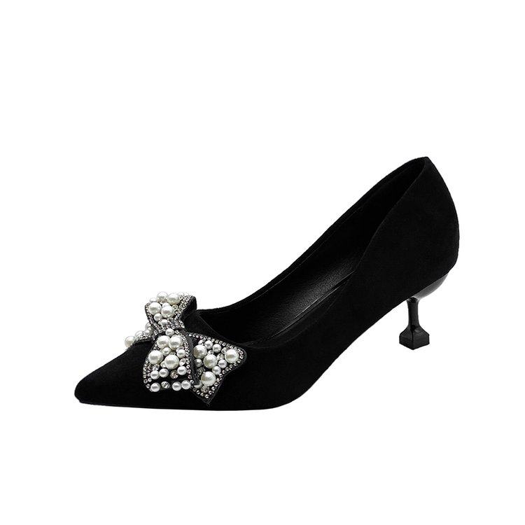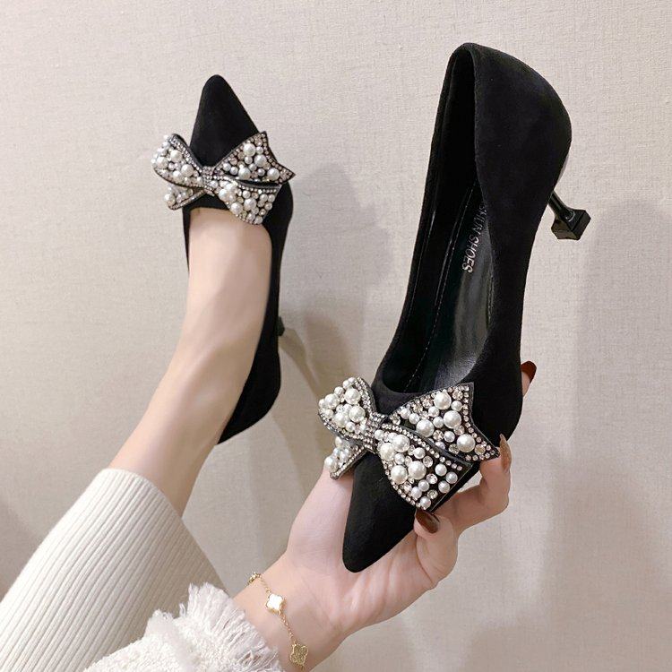 时尚珍珠蝴蝶结尖头细跟不累脚