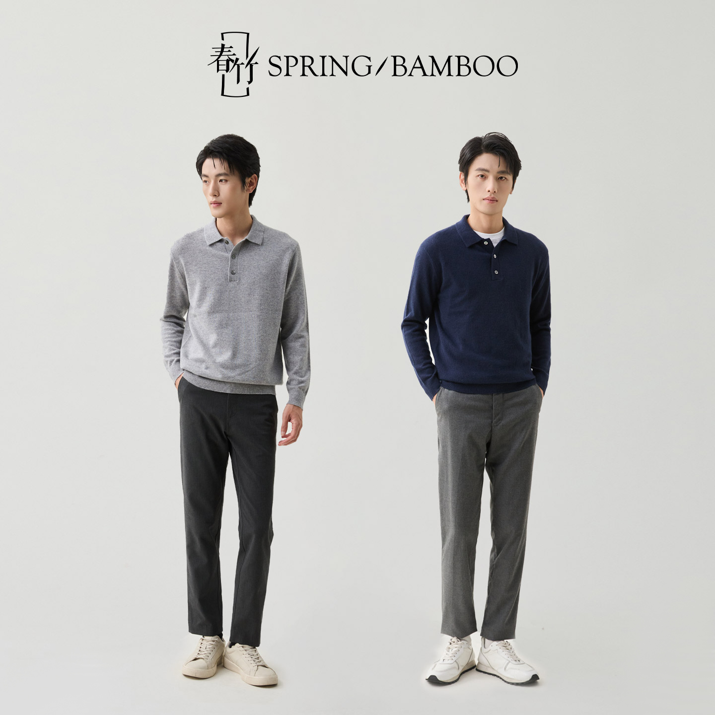 春竹2025秋冬新款100%山羊绒T恤领合体长袖针织毛衣男士羊绒衫