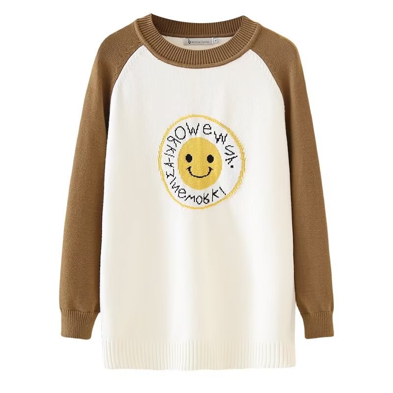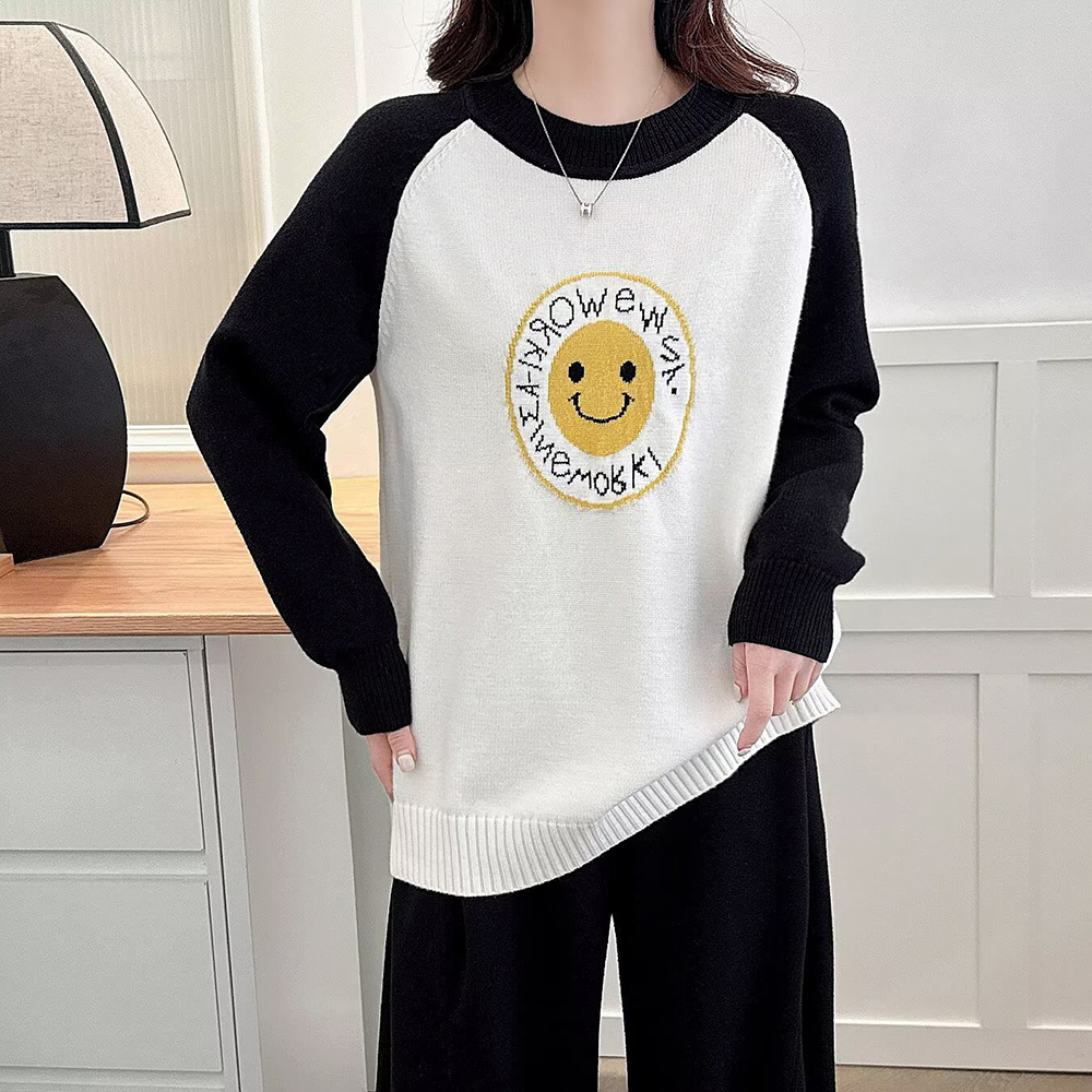 大码笑脸毛衣女200斤胖妹妹秋冬季新款撞色圆领针织衫显瘦打底衫