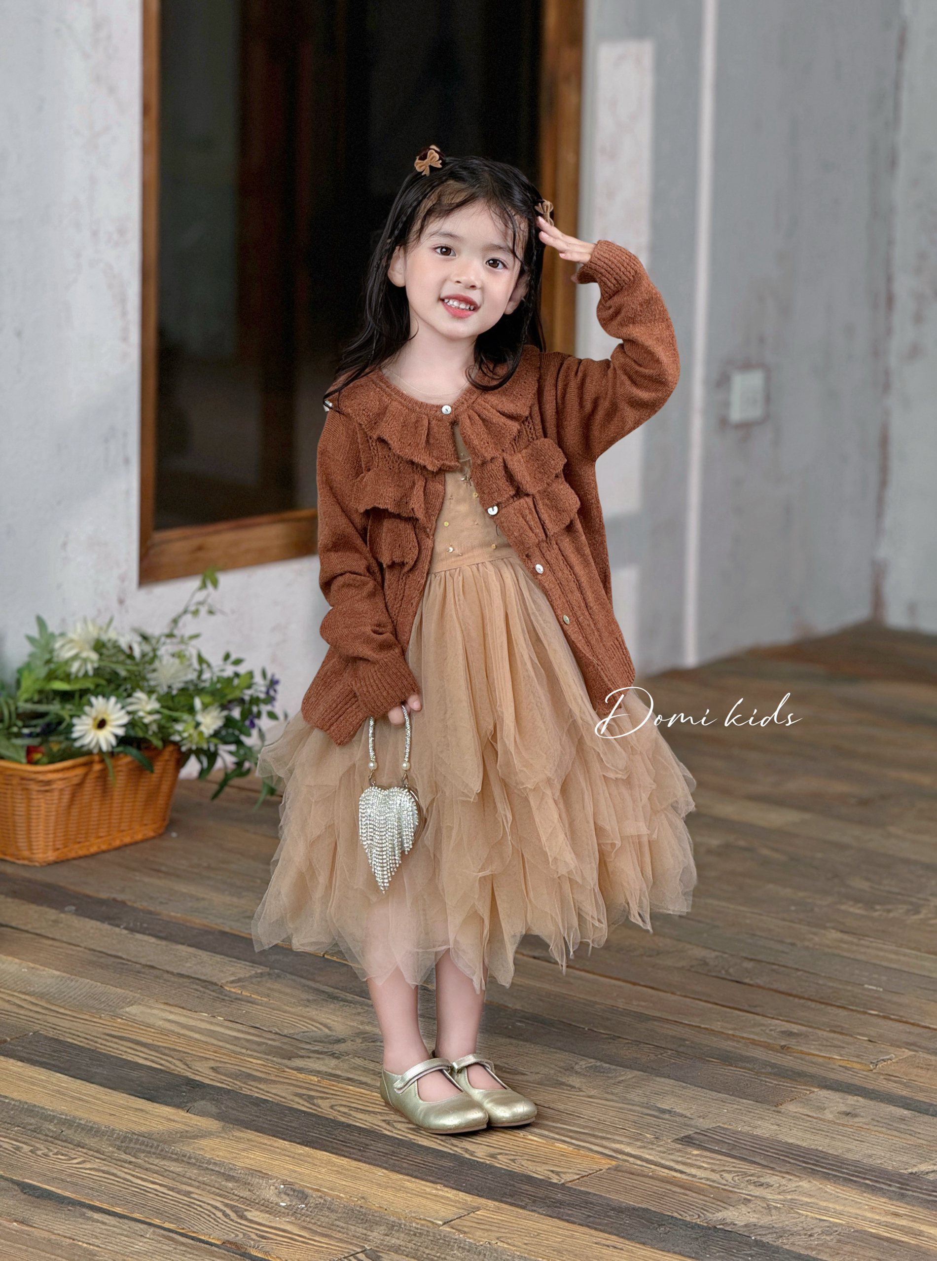 女童秋季连衣裙2025新款手工钉珠网纱裙+焦糖色针织毛衣开衫套装
