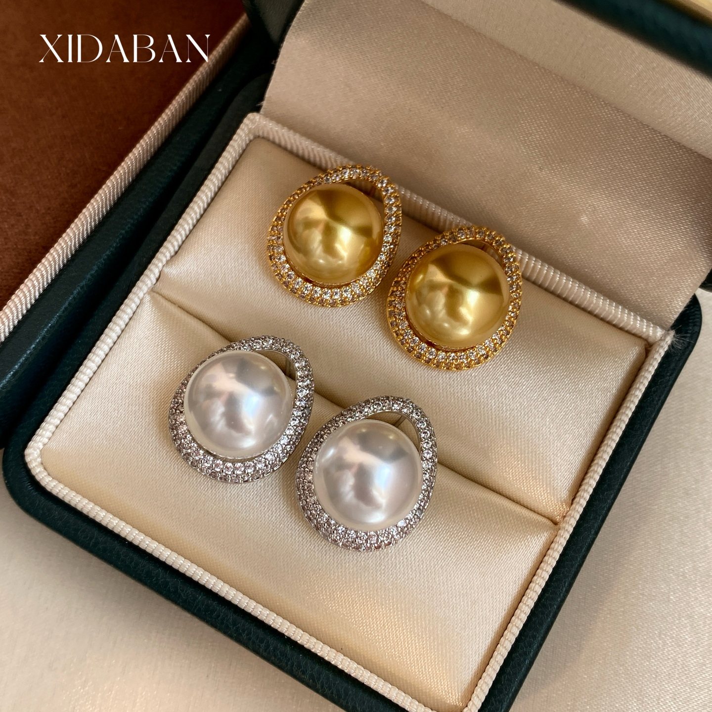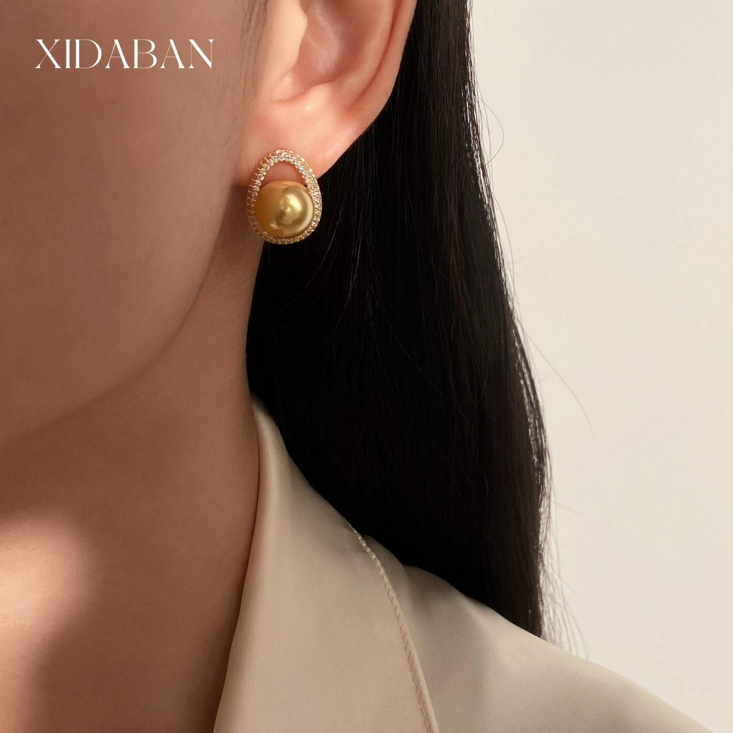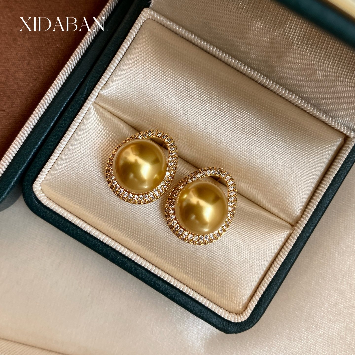 极光正圆澳白南洋金珍珠耳环轻奢高级感仿海水微镶锆爆闪小众耳钉