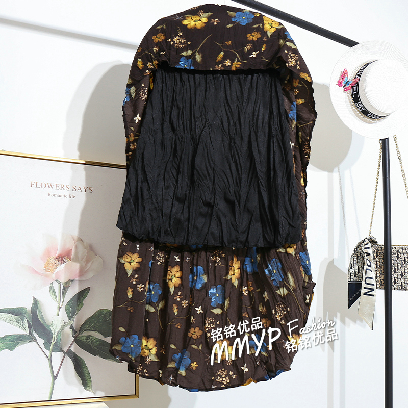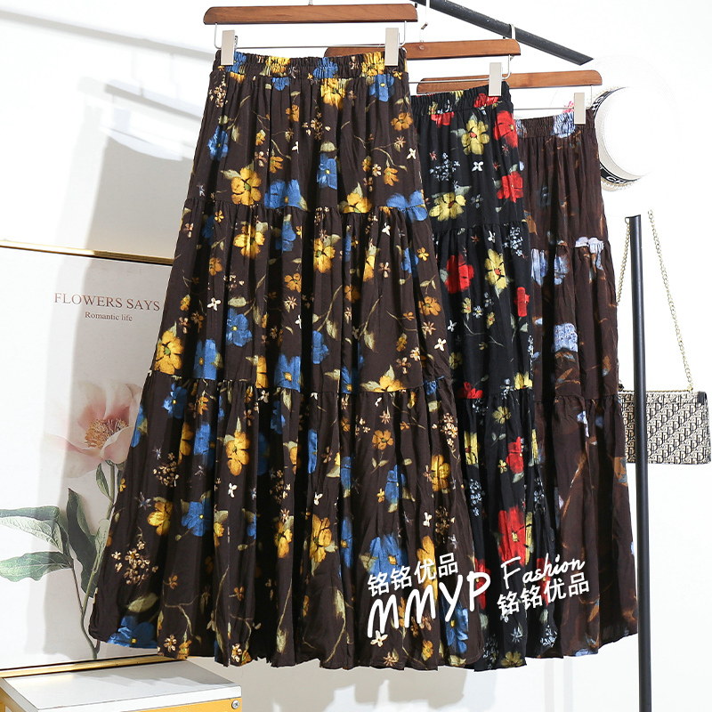 秋冬复古印花褶皱拼接大摆蛋糕半身裙女2025新款高腰显瘦秋季长裙
