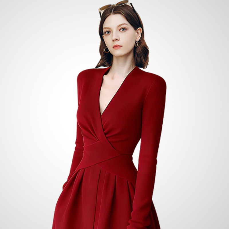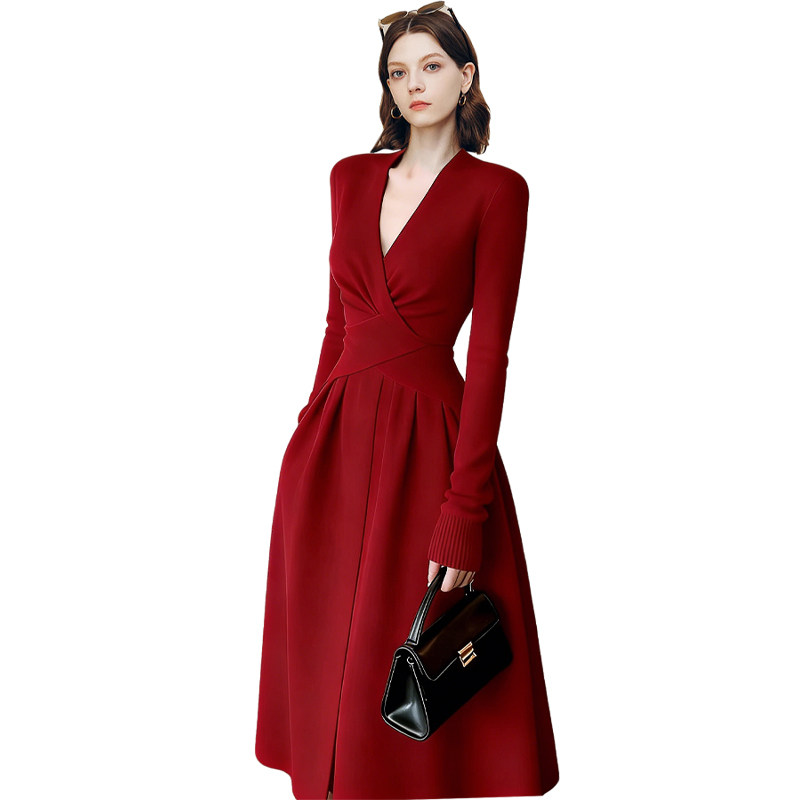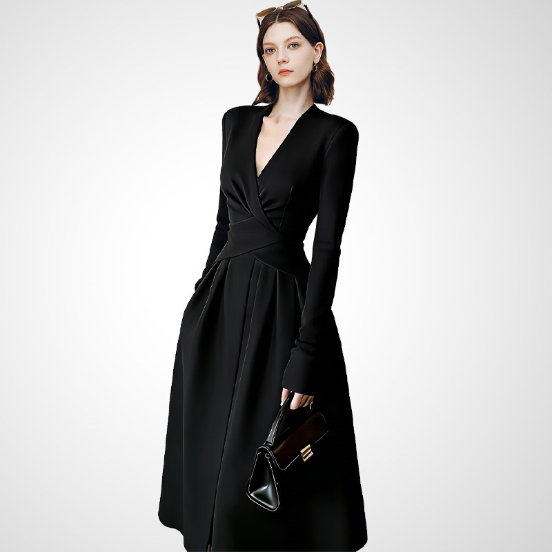 兰卡时尚V领交叉收腰连衣裙女2026春收腰修身气质通勤大裙摆长裙